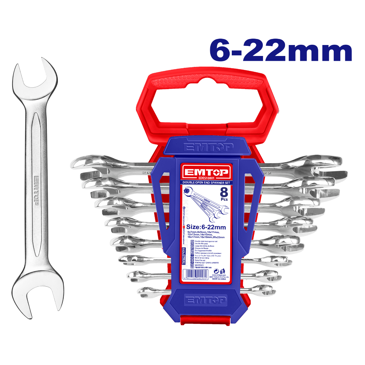 Emtop 8 ədəd ikitərəfli açar dəsti Ölçülər: 6-22mm 6x7mm, 8x9mm, 10x11mm, 12x13mm, 14x15mm, 16x17mm, 18x19mm, 20x22mm İncə parlatma Plastik asqıda qablaşdırılmış