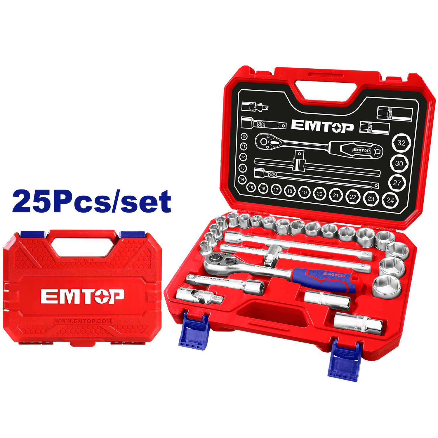 Emtop 25Pcs 1/2" Dəzgah dəsti Daxildir: 1Pcs 1/2" Dr Ratchet açar, 45T 18Pcs 1/2" Dr Dəzgah: 10-11-12-13-14-15-16-17-18-19-20-21-22-23-24-27-30-32mm 1Pcs 1/2" Dr Universal Birlik 2Pcs 1/2" Dr Uzadıcı Bar: 125mm & 250mm 2Pcs İspark Plug Dəzgah: 16mm & 21mm 1Pcs 1/2"*250mm Sürüşkən T çubuğu Material: CR-V (50BV30), istilik müalicəsi BMC-də qablaşdırılıb