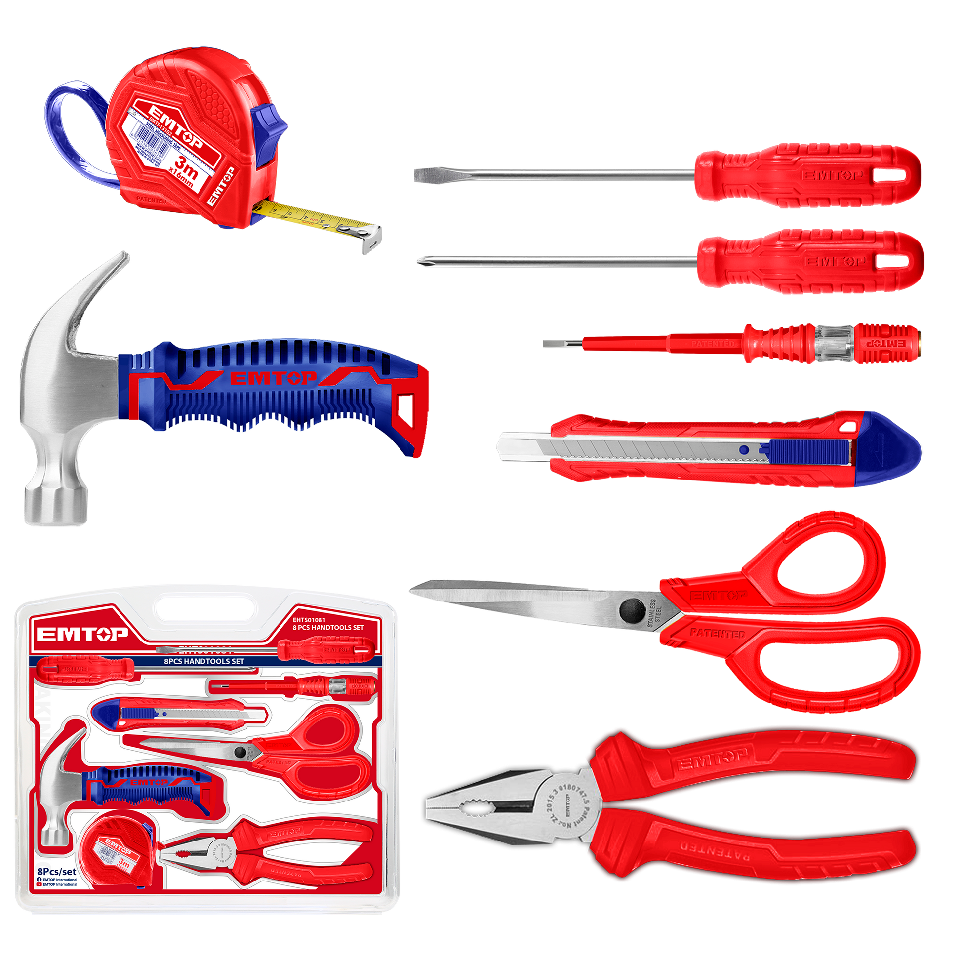 Emtop 8 ədəd əl alətləri dəsti Daxildir: 1 ədəd 7" kombinə edilmiş kəlbətin 1 ədəd test qələmi (Test gərginliyi: 100-500VAC) 1 ədəd 8oz mini dırnaq çəkici 1 ədəd 8" qayçı 1 ədəd 9mm çıxan bıçaq 1 ədəd SL5.5x100 tornavida 1 ədəd PH1x100 tornavida 1 ədəd 3m polad ölçü lenti İkiqat blisterdə qablaşdırılmış