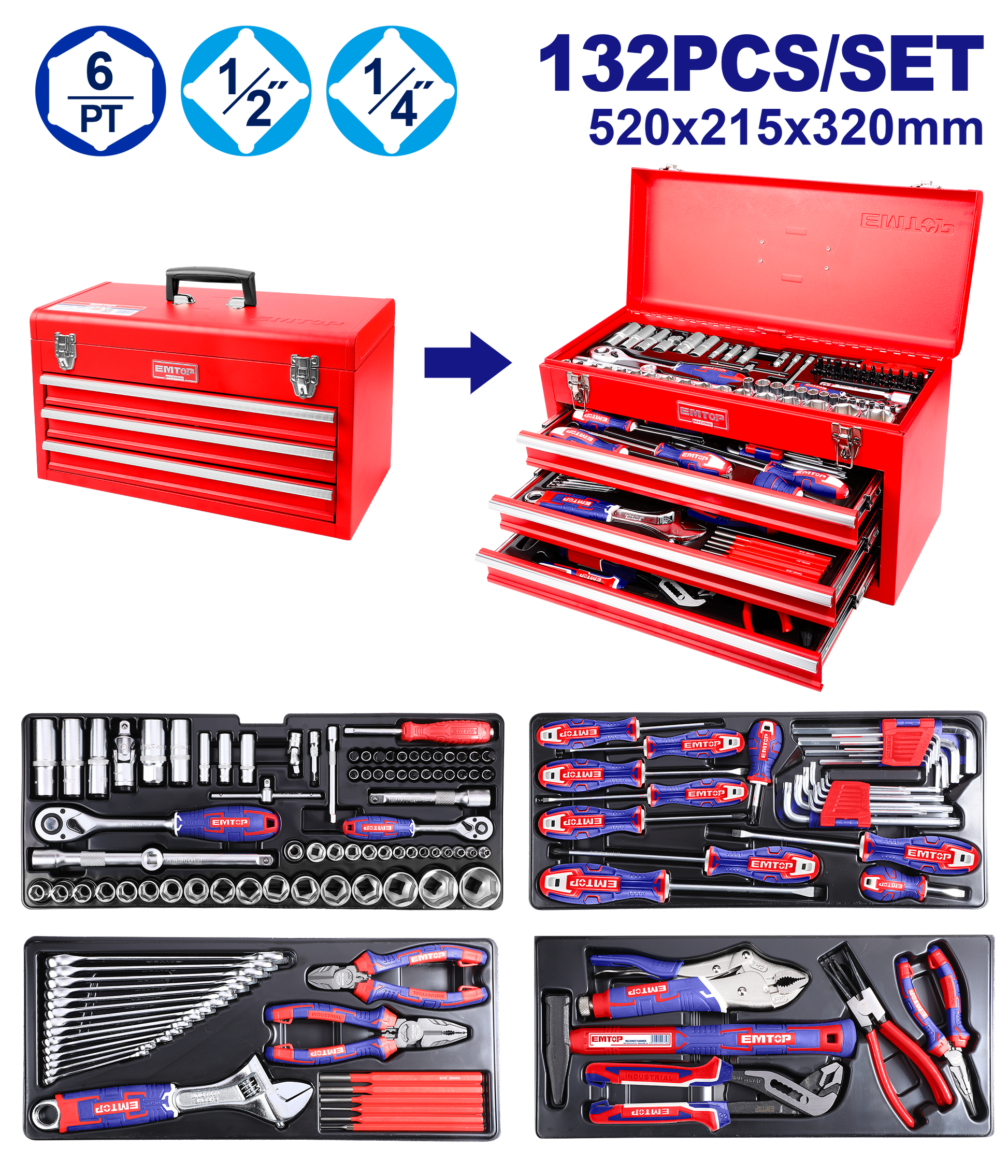 132 ədəd Alət Dolabı Dəsti Dolab hissəsi:Ümumi ölçü: 520 × 218 × 320 mmDolab qalınlığı: 0.8 mmÇəkme qalınlığı: 0.6 mm1 ədəd 510 × 210 × 60 mm Üst tray sahəsi3 ədəd 449 × 196 × 54 mm çəkme Alətlər hissəsi:1 ədəd 1/4" ratchet açar13 ədəd 1/4" şalbanbaşı: 4, 4.5, 5, 5.5, 6, 7, 8, 9, 10, 11, 12, 13, 14 mm25 ədəd 1/4" × 32 mm uzunluğunda bit şalbanbaşı: Altıbucaqlı: 3, 4, 5, 6, 7, 8, 10 mm Ulduz: T8, T10, T15, T20, T25, T27, T30, T40 SL: 4, 5.5, 6.5, 8 mm PH: 1, 2, 3 PZ: 1, 2, 33 ədəd 1/4"DR 50 mm uzunluğunda dərin şalbanbaşı: 8, 10, 12 mm2 ədəd 1/4"DR uzatma şaftı: 50 mm və 100 mm1 ədəd 1/4" × 150 mm spinner tutacaq1 ədəd 1/4" universal birləşmə1 ədəd 1/4" × 114 mm sürüşən T tutacaq1 ədəd 1/2" ratchet açar1 ədəd 1/2" universal birləşmə18 ədəd 1/2"DR şalbanbaşı: 10, 11, 12, 13, 14, 15, 16, 17, 18, 19, 20, 21, 22, 23, 24, 27, 30, 32 mm3 ədəd 1/2"DR 77 mm uzunluğunda dərin şalbanbaşı: 13, 17, 19 mm2 ədəd 1/2" buji şalbanbaşı: 16 mm və 21 mm2 ədəd 1/2"DR uzatma şaftı: 125 mm və 250 mm1 ədəd 1/2" üçlü adaptör: 3/8"(F) x 1/2(M)10 ədəd tornavida: SL3×75, SL4×100, SL5.5×100, SL6.5×38, SL6.5×125, SL8×150, PH0×75, PH1×100, PH2×38, PH2×15014 ədəd kombinasiyalı açar: 6, 7, 8, 9, 10, 11, 12, 13, 14, 15, 16, 17, 18, 199 ədəd altıbucaqlı açar: 1.5, 2, 2.5, 3, 4, 5, 6, 8, 109 ədəd Torx açar: T10, T15, T20, T25, T27, T30, T40, T45, T501 ədəd 10" əyilmiş dişli kilid açar1 ədəd 10" su nasosu qəlibi1 ədəd 6" yüksək leverage uzun burunlu pense1 ədəd 7" yüksək leverage kombinasiyalı pense1 ədəd 6" yüksək leverage enli kəsici pense2 ədəd circlip pense1 ədəd 300 q çəkili mexanik çəkic1 ədəd 10" tənzimlənən açar6 ədəd pin punch: 1.5×152 mm, 3×152 mm, 4×152 mm, 5×152 mm, 6×152 mm, 8×152 mm Qablaşdırma: blister + karton qutu