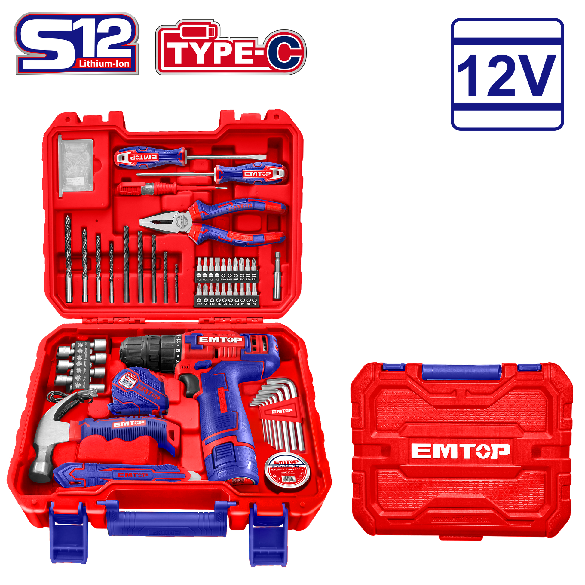 Emtop 96 ədəd məişət alətləri dəsti Daxildir: 1 ədəd 12V Litium-İon akkumuliyatorlu burğu (ECDL12510) 1 ədəd 1.5Ah batareya bloku (EBPK12153) 1 ədəd USB şarj kabeli Yüksüz sürət: 0-750rpm Maksimum fırlanma momenti: 20Nm Çak tutumu: 0.8-10mm Fırlanma momenti tənzimləmələri: 15+1 Alətlər: 1 ədəd SL5.5x100 tornavida 1 ədəd PH1x100 tornavida 1 ədəd 7" kombinə edilmiş kəlbətin 1 ədəd 8oz mini dırnaq çəkici 1 ədəd test qələmi 1 ədəd 3m polad ölçü lenti 1 ədəd 9mm çıxan bıçaq 8 ədəd altıbucaqlı açar: 1.5, 2, 2.5, 3, 4, 5, 5.5, 6mm 1 ədəd PVC izolyasiya lentası 7 ədəd güc hülqəsi (Cr-V): 5, 6, 7, 8, 9, 10, 11mm 5 ədəd burğucuq bitləri: 2, 3, 4, 5, 6mm 4 ədəd ağac burğucuq bitləri: 4, 5, 6, 8mm 1 ədəd maqnit bit tutucu 20 ədəd tornavida bitləri: SL3, SL4, SL5, SL6, PH0, PH1, PH2, PH3, PZ0, PZ1, PZ2, PZ3, T10, T15, T20, T30, H3, H4, H5, H6 20 ədəd vint: 10 ədəd * ST3.5, 10 ədəd * ST4 20 ədəd plastik tapa: 10 ədəd * 6mm, 10 ədəd * 5mm Daşıma çantasında qablaşdırılmış