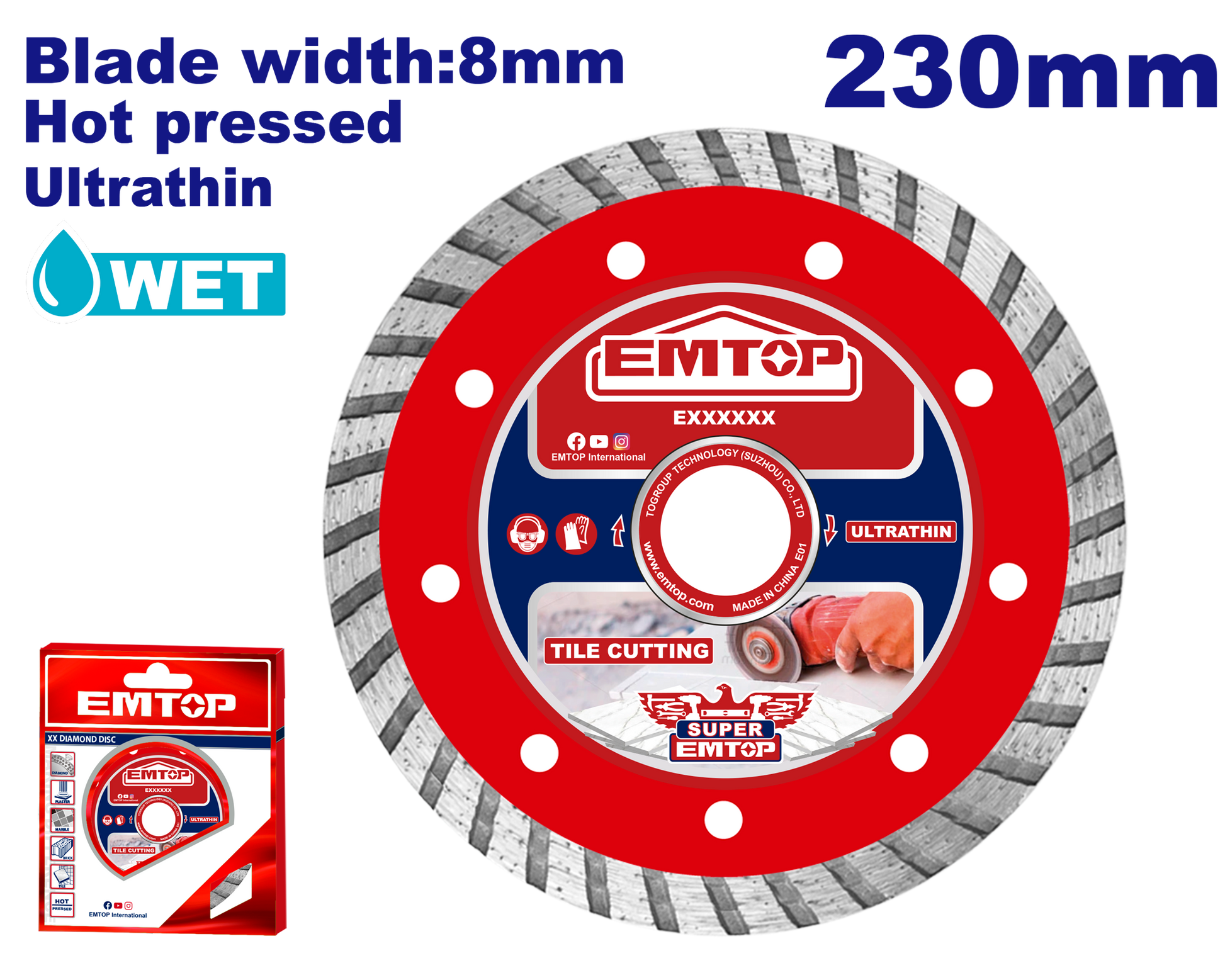 Emtop Ölçü: 230 mm x 22.2 mm Diş genişliyi: 8 mm Metal baza qalınlığı: 1.6 mm Universal məqsəd: Keramika, plitə, mərmər, kərpic Vitrified kərpic (nano şüşə) üçün istifadə etməyə icazə verilmir Qablaşdırma: Rəngli qutuda qablaşdırılmış