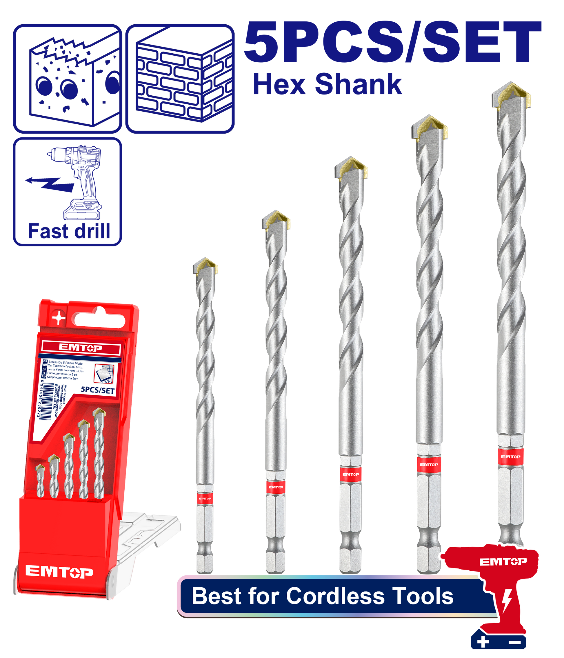 5 ədəd daş qazma ucu dəstiÖlçülər: 4×85, 5×95, 6×100, 8×120, 10×120Yüksək qazma effektivliyiSement, beton, kərpic və blok qazmaq üçün uyğundurQablaşdırma: plastik qutu ilə