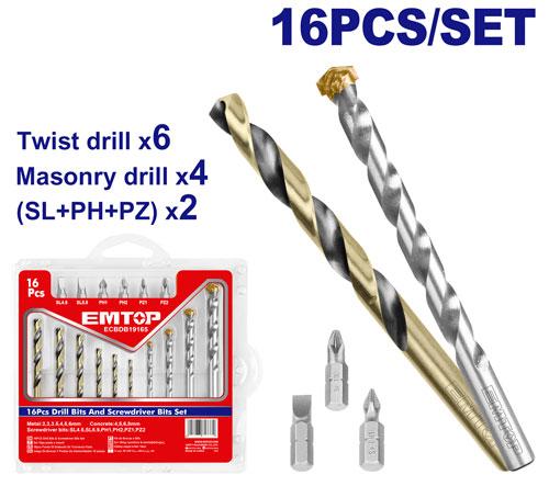 Emtop 16 ədəd dəzgah bitləri və vida sürücüsü bitləri dəsti6 ədəd HSS spiral deşik açıcı bitləriÖlçülər: 2, 3, 3.5, 4, 5, 6mm4 ədəd daş deşik açıcı bitləriÖlçülər: 4, 5, 6, 8mm6 ədəd 25mm vida sürücüsü bitləriSL4.5, SL5.5, PH1, PH2, PZ1, PZ2İkiqat blisterdə qablaşdırılmış