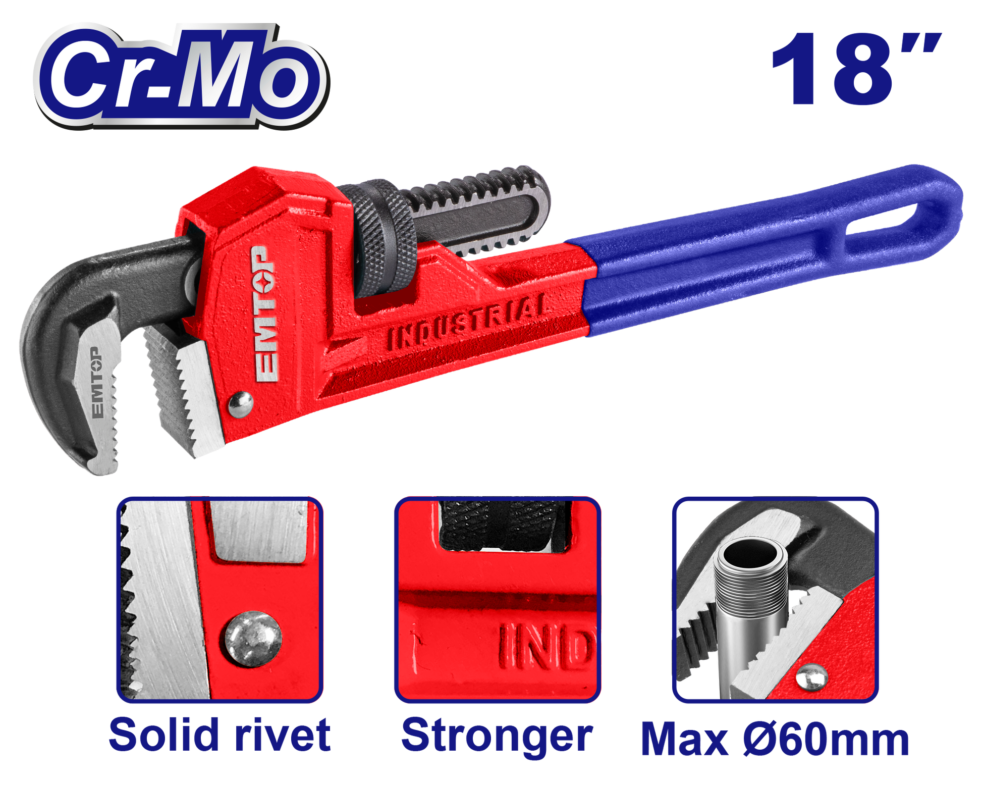 Ölçü: 18" (450mm)Maksimum sıxma diametri: 60mmHərəkətli çən materialı: Cr-MoXüsusiyyət: Aktiv olmayan müalicəBədən materialı: Dökülmə zəngin dəmirYüzey: Qara örtüklü və cilalanmışBir parça nitQablaşdırma: Kağız kart ilə