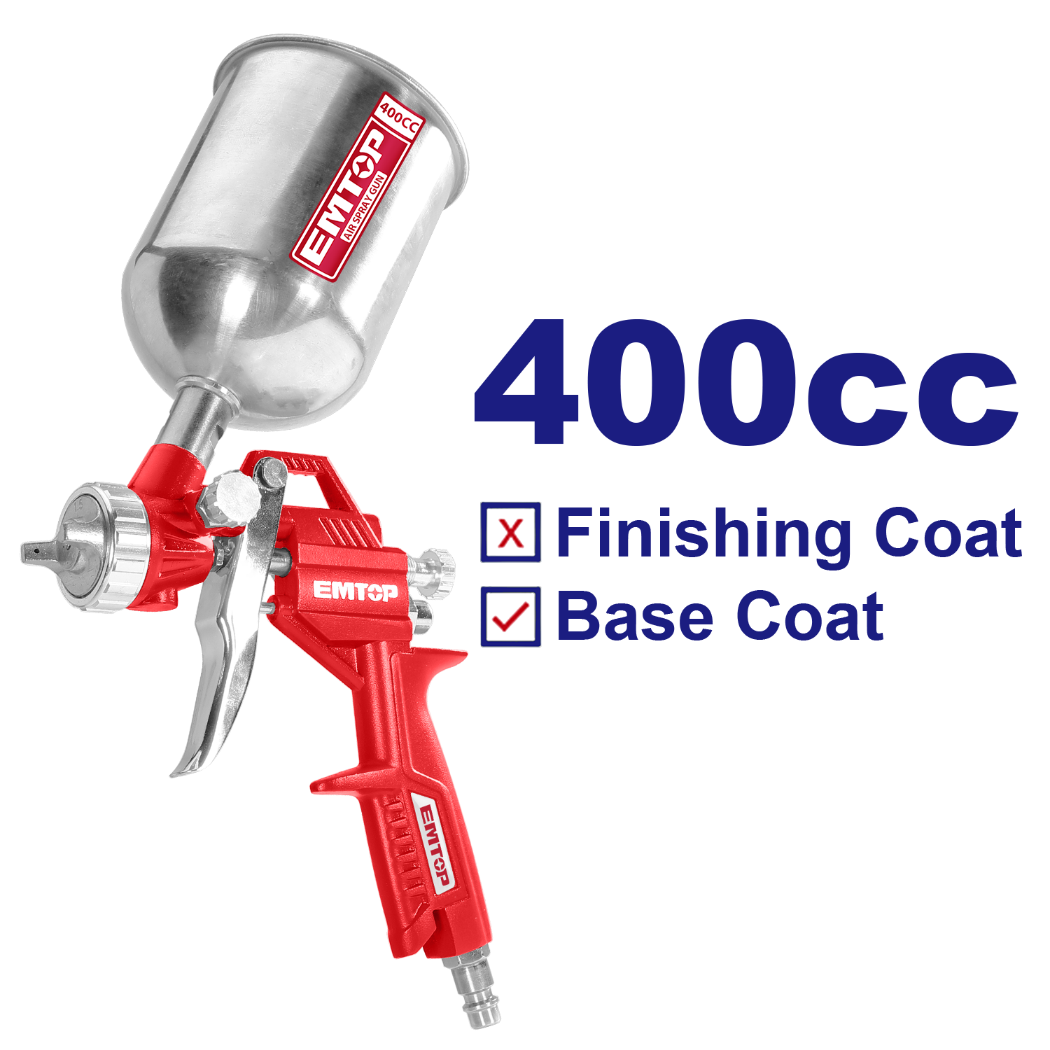 Emtop Standart nozzle: 1.5mm Nümunə genişliyi: 180-250mm Boyama tutumu: 400cc Əsas qat üçün uyğundur Avropa tipli, ABŞ tipli, Nitto tipli və İtaliya tipli konnektorlarla birlikdə Seçim nozzle: 1.2-1.8mm İş təzyiqi: 3-4bar Hava istehlakı: 4.2-7.1cfm (119-200l/min) Rəngli qutuda qablaşdırılmış