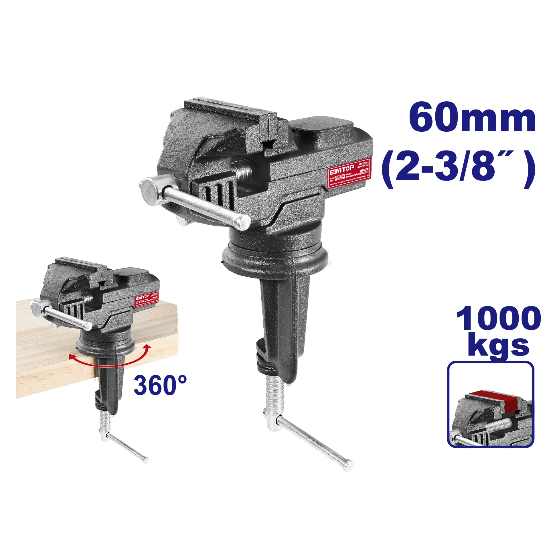 Emtop Dönər baza ölçüsü: 60 mm Çəki: 1.7 kq Maksimal sıxma gücü: 1000 kq Dəmir üzlüklü Karton qutu ilə paketlənmişdir.