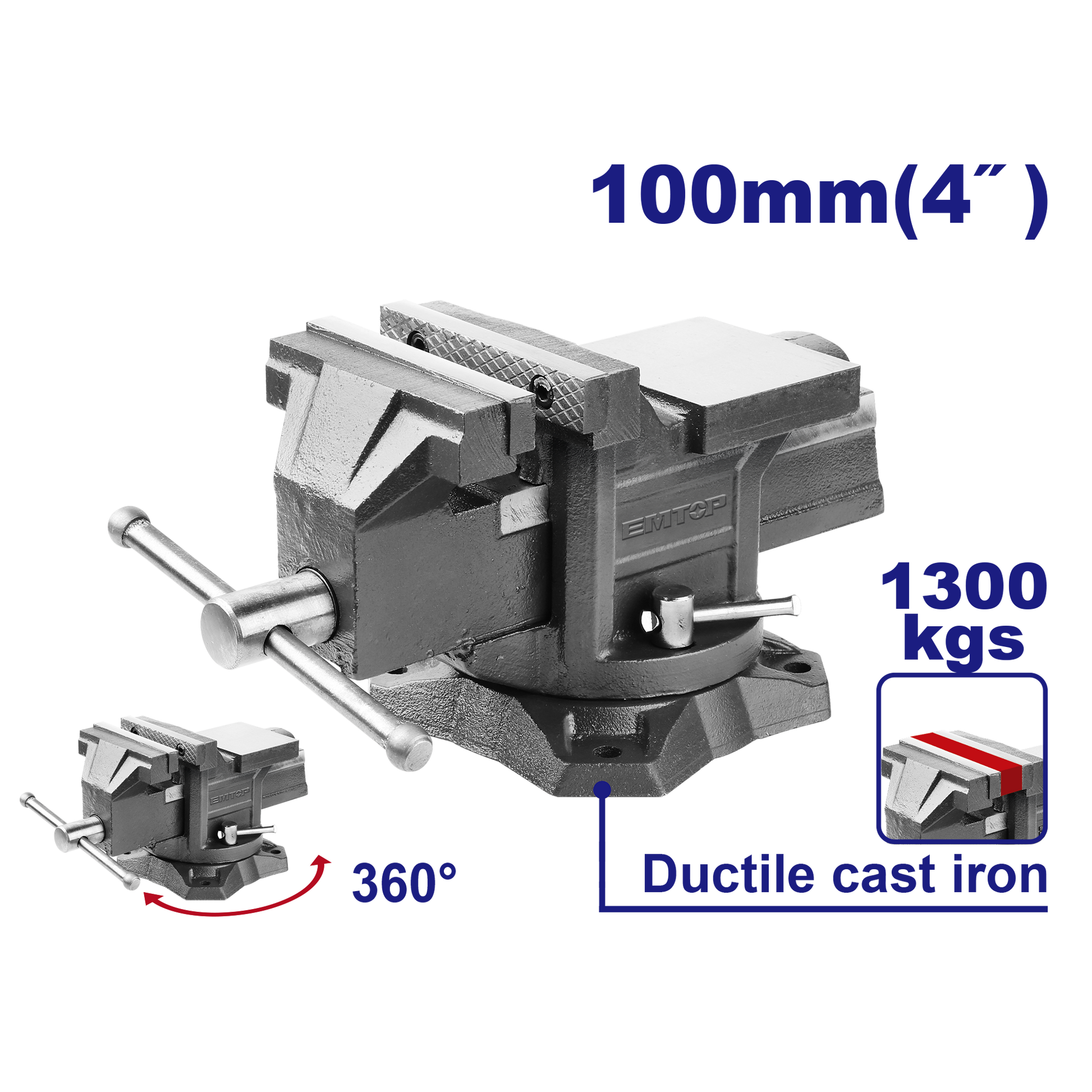 Emtop Dönər baza ölçüsü: 4" Çəki: 6.7 kq Maksimal sıxma gücü: 1300 kq Dəmir üzlüklü Karton qutu ilə paketlənmişdir.