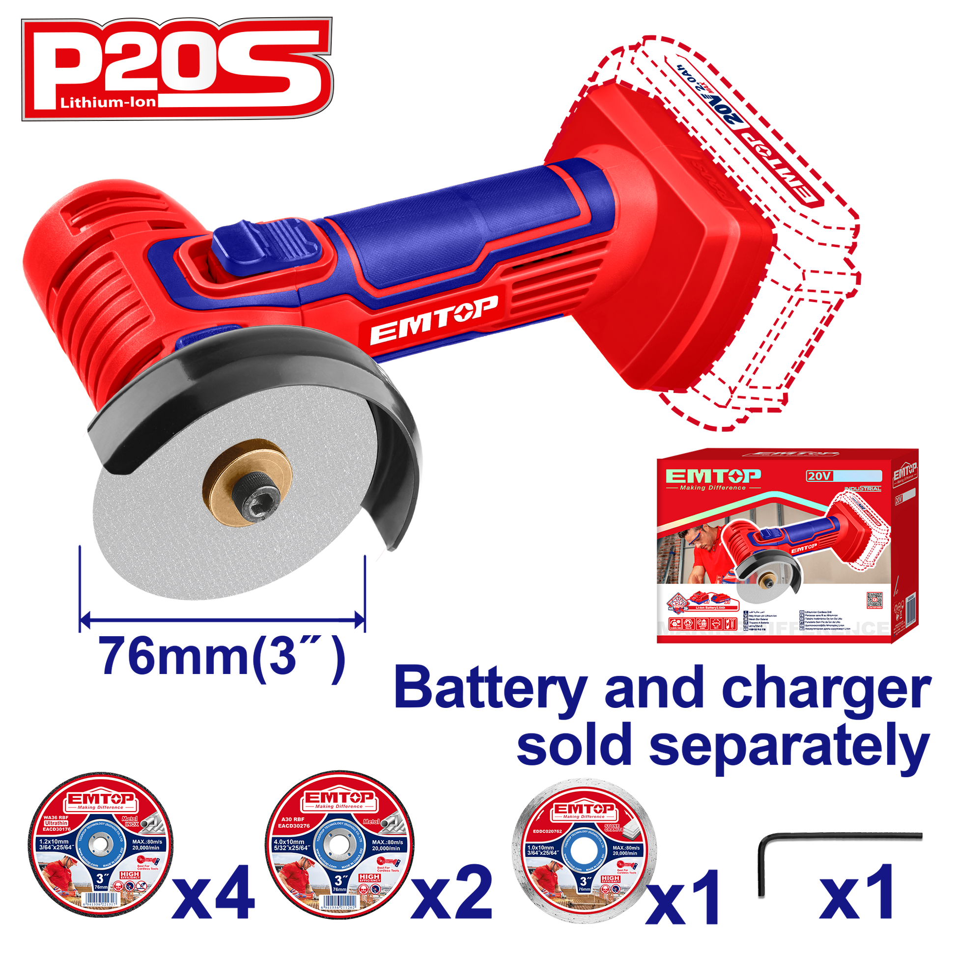 Gərginlik: 20VBoş dövrə sürəti: 19500rpmDisk diametri: 76mm (3")Mil ipi: M6Disk yeri: solDaxildir: 4 ədəd metal kəsmə abraziv diski 2 ədəd metal əzirici abraziv diski 1 ədəd nəm daş diskiBatareya və şarj cihazı ayrıca satılırRəngli qutuya yığılmışdır
