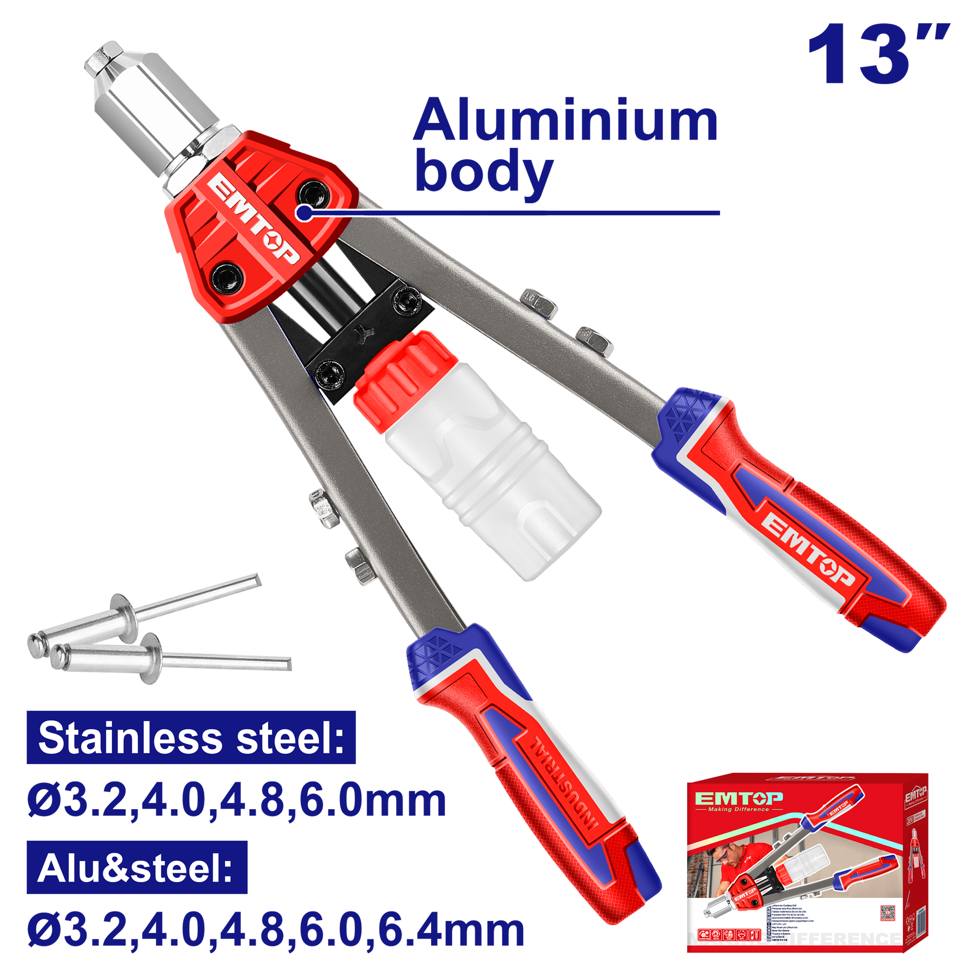 Ölçü: 330mm Yüksək istifadə sahələri: Paslanmayan polad, alüminium və polad perçinlər Paslanmayan polad perçinlər: φ3.2mm, 4.0mm, 4.8mm, 6.0mm Alüminium və polad perçinlər: φ3.2mm, 4.0mm, 4.8mm, 6.0mm, 6.4mm Əl perçinləmə alətinin materialı: Polad + Alüminium Rəngli qutuda qablaşdırılıb