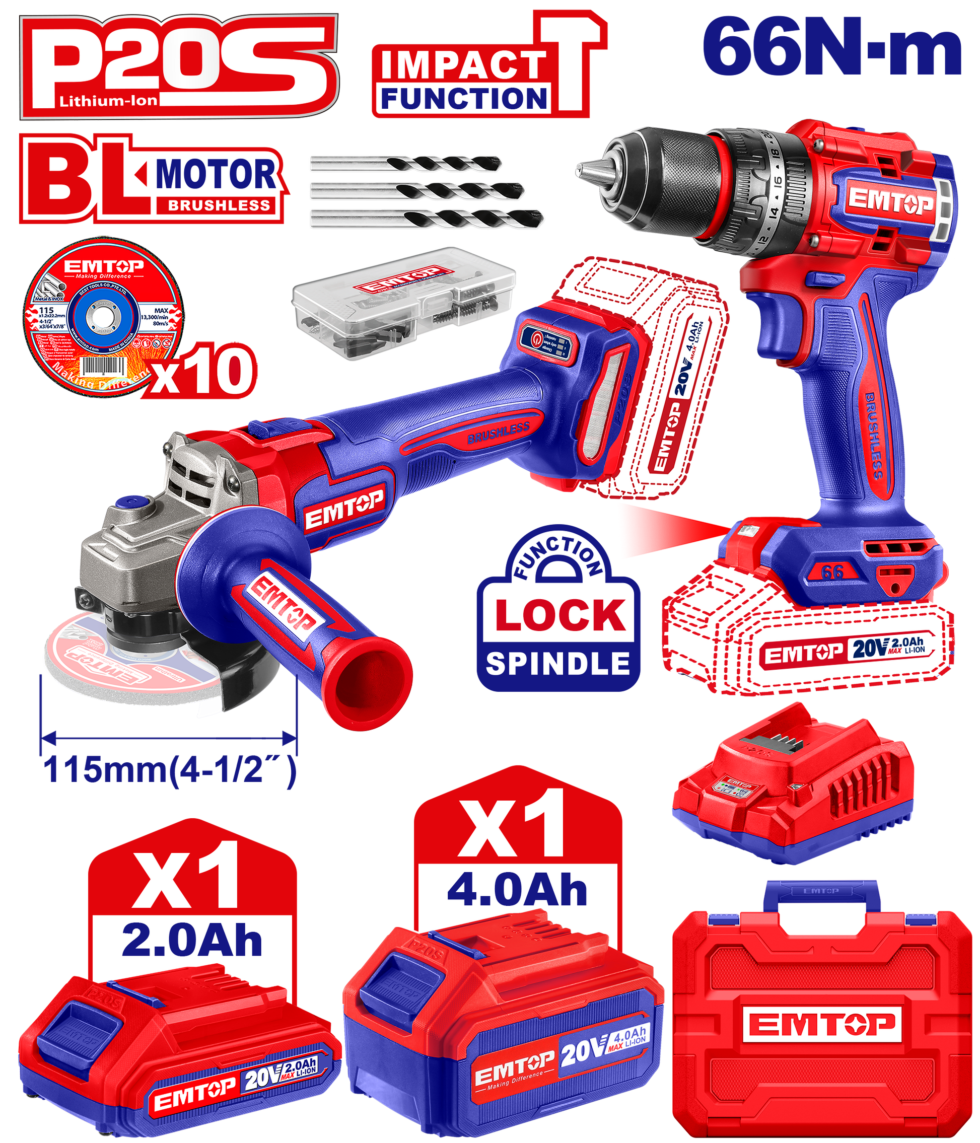 Emtop Gərginlik: 20VDaxildir:1 ədəd Litium-İon bucaqlı daşlama (ELAG21154)1 ədəd Litium-İon kompakt fırçasız simsiz matkap (ECIDL20602) Litium-İon bucaqlı daşlama (ELAG21154):Fırçasız motorGərginlik: 20VBoş yerdə sürət: 3000/6000/9000 rpmDisk diametri: 115mmMil mövzusu: M14 Litium-İon kompakt fırçasız simsiz matkap (ECIDL20602):Fırçasız motorGərginlik: 20VBoş yerdə sürət: 0-550/0-2000 rpmMaksimum fırlanma anı: 60NmMetal patronPatron tutumu: 13mmFırlanma anı tənzimləmələri: 22+1Avto-kilidli açarsız patronMexaniki 2 sürətli ötürücüMil kilidi funksiyasıİnteqrasiya olunmuş LED işıqLED batareya gücü göstəricisi Daxildir:1 dəst 115mm aşındırıcı metal kəsici disk (10 ədəd)47 ədəd aksesuar1 ədəd 2.0Ah batareya paketi (EBPK20011)1 ədəd 4.0Ah batareya paketi (EBPK20021)1 ədəd P20S Litium-İon batareya şarj cihazı (EFCR20200)Şarj gərginliyi: 220-240V~50/60HzDaşınma çantası ilə qablaşdırılıb