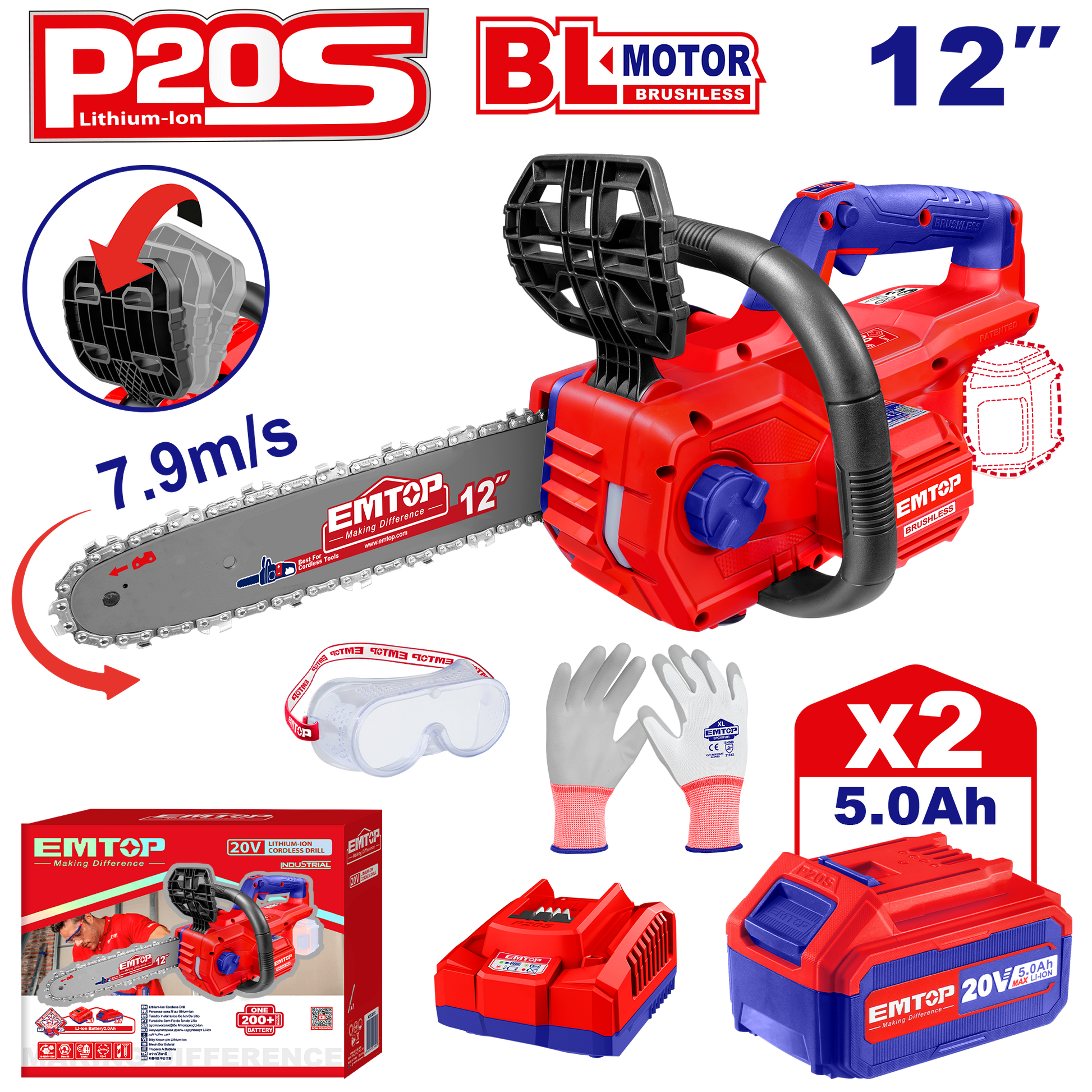 Emtop Fırçasız motorGərginlik: 20VZəncir sürəti: 7.9 m/sBar uzunluğu: 12" (30cm)Sürətli zəncir əyləci funksiyasıAvtomatik yağlama sistemi Daxildir:1 ədəd 12" mişar zənciri1 ədəd 12" zəncirli mişar barı1 ədəd PU örtüklü əlcək1 ədəd təhlükəsizlik eynəyi2 ədəd 5.0Ah batareya paketi (EBPK2003)1 ədəd 4A şarj cihazı (EFCR20411E)Şarj gərginliyi: 220-240V~50/60HzRəngli qutu ilə qablaşdırılıb