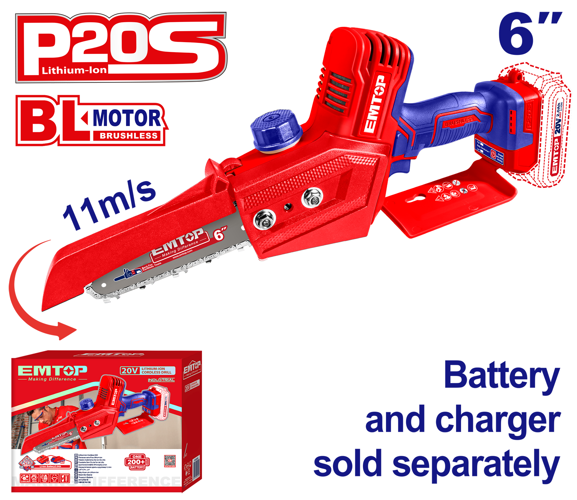 Fırçasız mühərrikGərginlik: 20VBıçaq uzunluğu: 6" (15 sm)Zəncir sürəti: 11 m/sAvtomatik yağlama Daxildir: 1 ədəd 6" zəncirli mişar zənciri 1 ədəd 6" zəncirli mişar bıçağı Batareya və şarj cihazı ayrıca satılırRəngli qutuda qablaşdırılıb