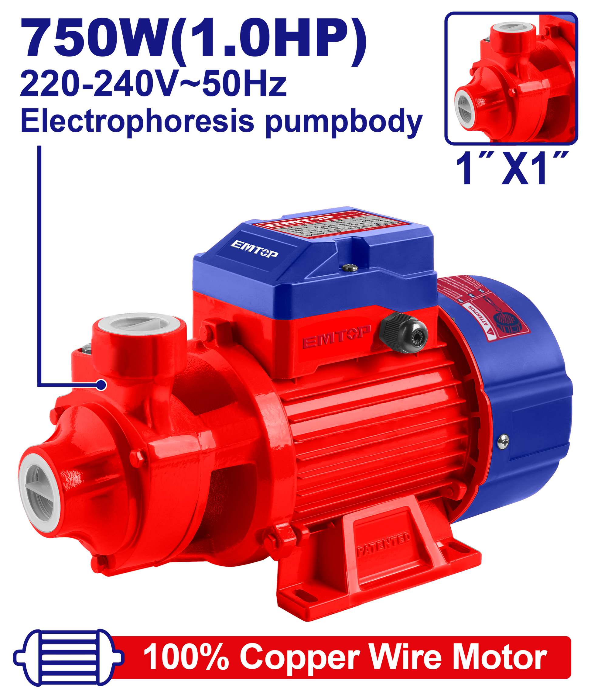 Emtop Periferik nasos Gərginlik: 220-240V~50Hz Nominal güc: 750W (1HP) Maksimum baş: 52m Maksimum axın: 50L/dk Maksimum suluq: 8m Borunun diametri: 1""x1"" Mis tel mühərriki Brass impeller 0.3m uzunluğunda kabel Kartondan qutuda qablaşdırılmış