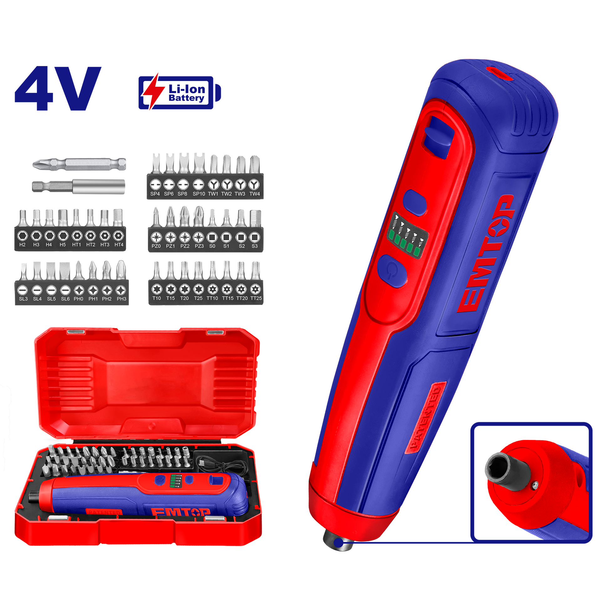 Emtop Gərginlik: 4V Altıbucaqlı ucluq: 1/4"" Yük olmayan sürət: 240rpm Maksimum fırlanma anı: 4N.m İnteqrasiya olunmuş işıq Şarj səviyyəsi göstəricisi 40 ədəd 25mm Cr-V bit və tutacaq ilə 1 ədəd 50mm Cr-V bit və tutacaq ilə 5 ədəd maqnitli bit tutacağı ilə Plastik qutuda qablaşdırılmış