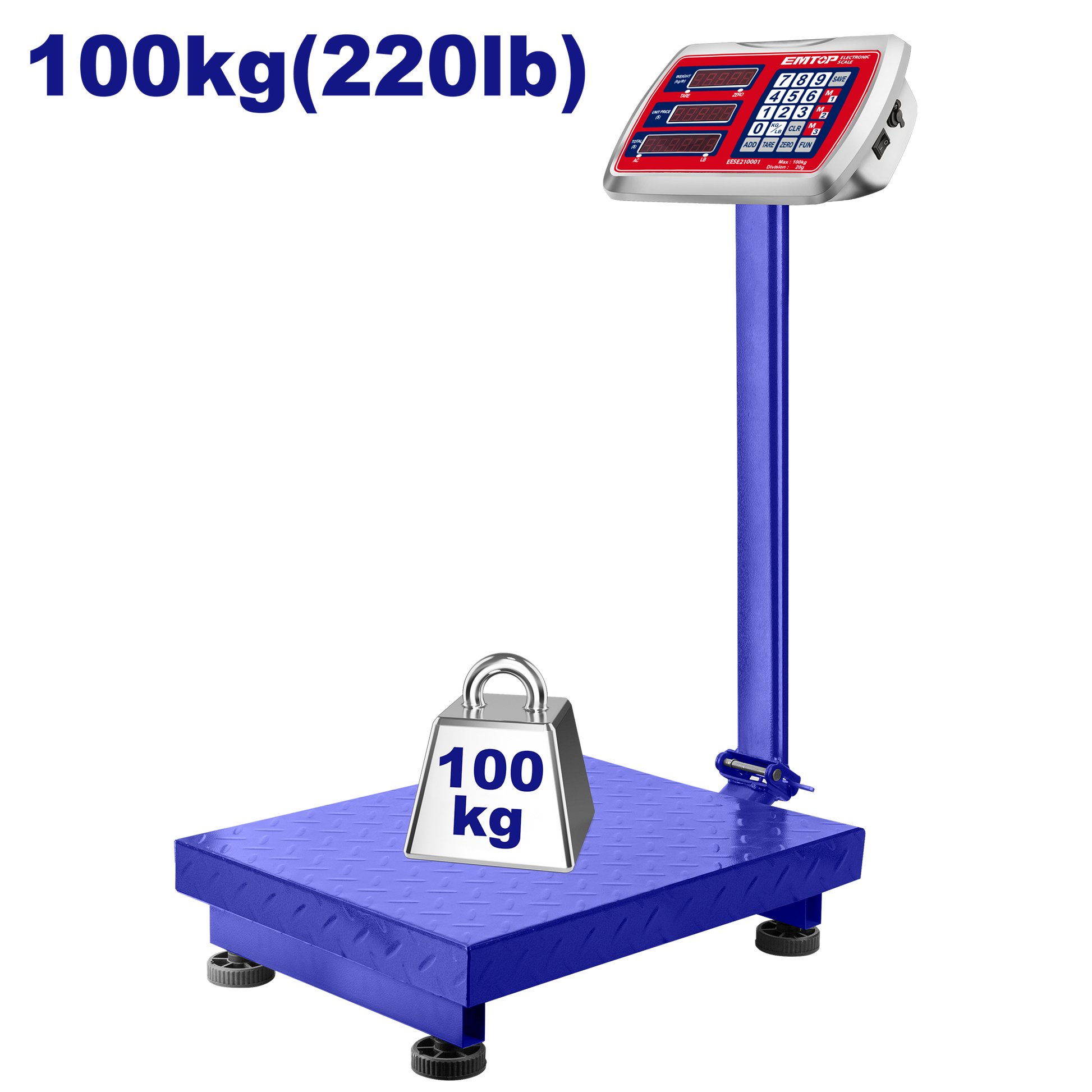 Emtop Maksimal çəki: 100kg 20g bölmə Ekran: LED Cədvəl ölçüsü: 300 x 400mm Şarj gərginliyi: 220-240V 50/60Hz Kartonda qablaşdırılmış