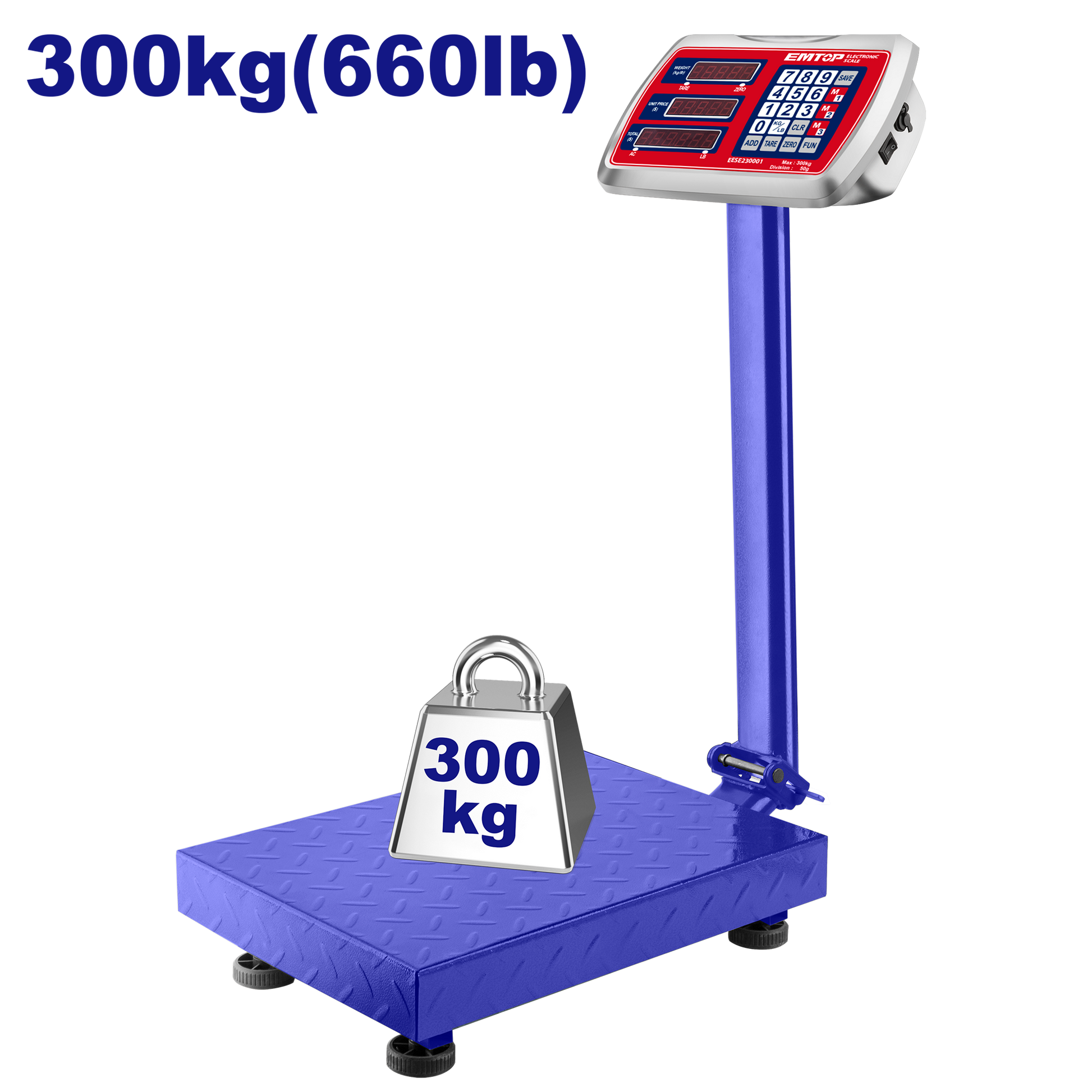 Emtop Maksimal çəki: 300kg 50g bölmə Ekran: LED Cədvəl ölçüsü: 400 x 500mm Şarj gərginliyi: 220-240V 50/60Hz Kartonda qablaşdırılmış