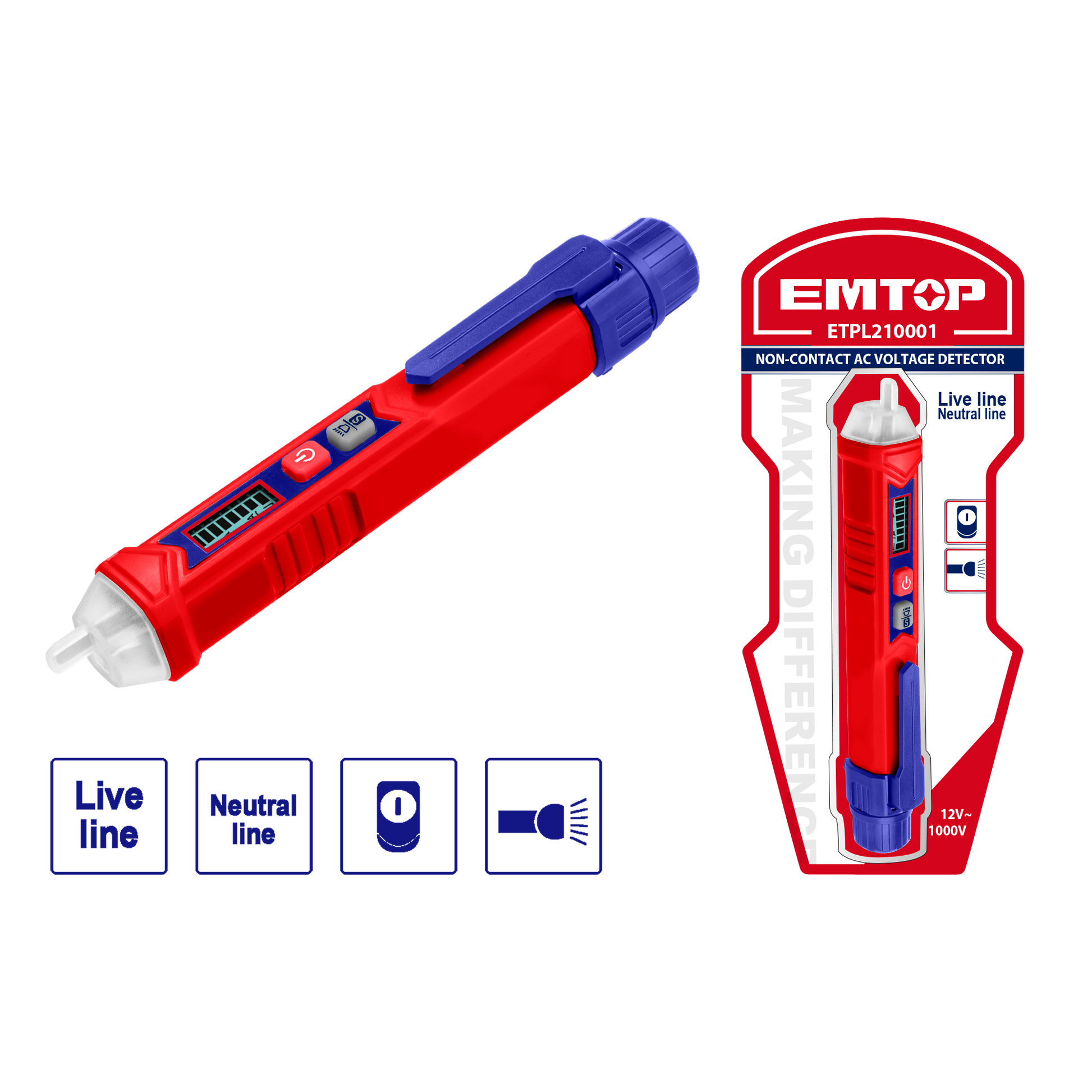 Emtop AC gərginlik: 12V~1000V (Yüksək həssaslıq) 48~1000V (Aşağı həssaslıq) Tezlik: 50/60Hz Siqnal rejimi: Səs və işıq siqnalı Flaş işıq: Ağ LED Aşağı batareya göstəricisi Avtomatik enerji sönməsi Dəyişdirilə bilən batareya qapağı Canlı xətti və neytral xətti avtomatik fərqləndirir 2 ədəd LR03 AAA batareya ilə İkiqat blister ilə qablaşdırılmış