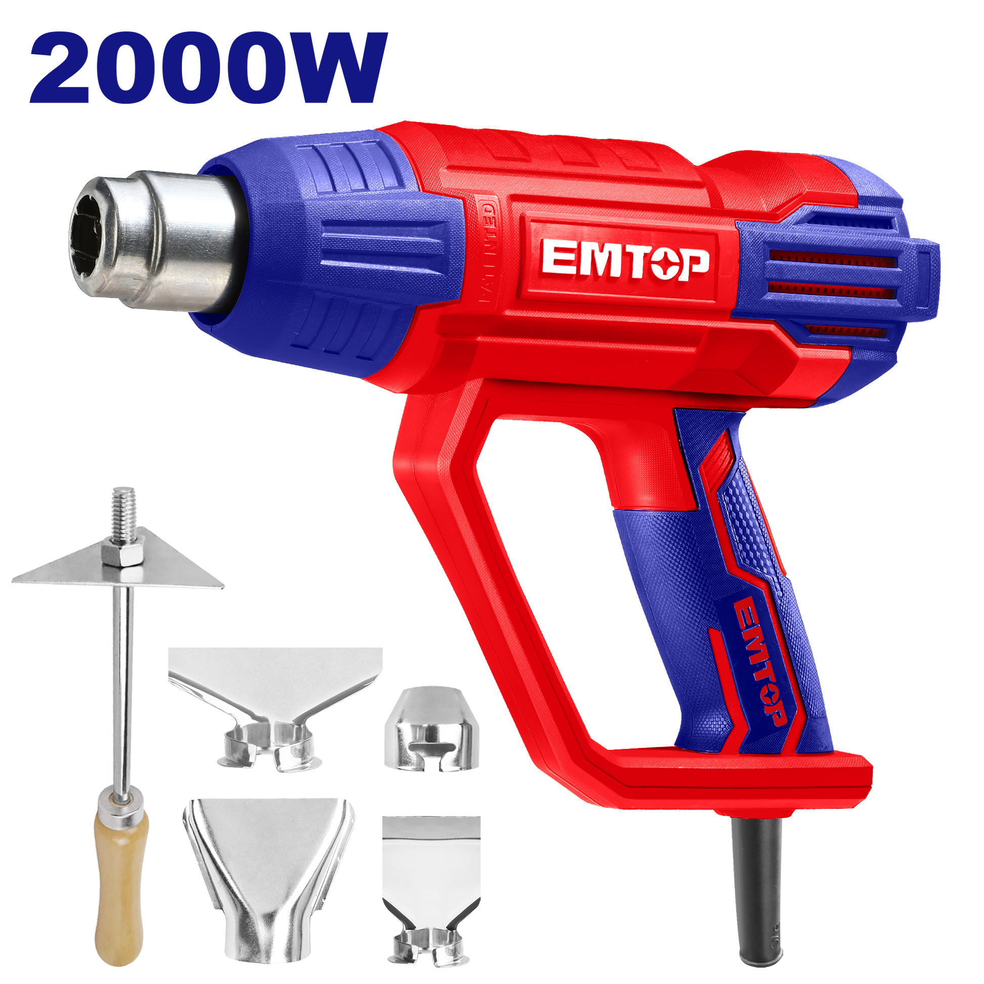 Emtop Gərginlik: 220-240V~50/60Hz Giriş gücü: 2000W Temperatur: 50°C/380°C/570°C Hava axını: 500/300/500 L/dəq 1 ədəd qırıcı və 4 ədəd nozzle ilə Rəngli qutuda qablaşdırılmış