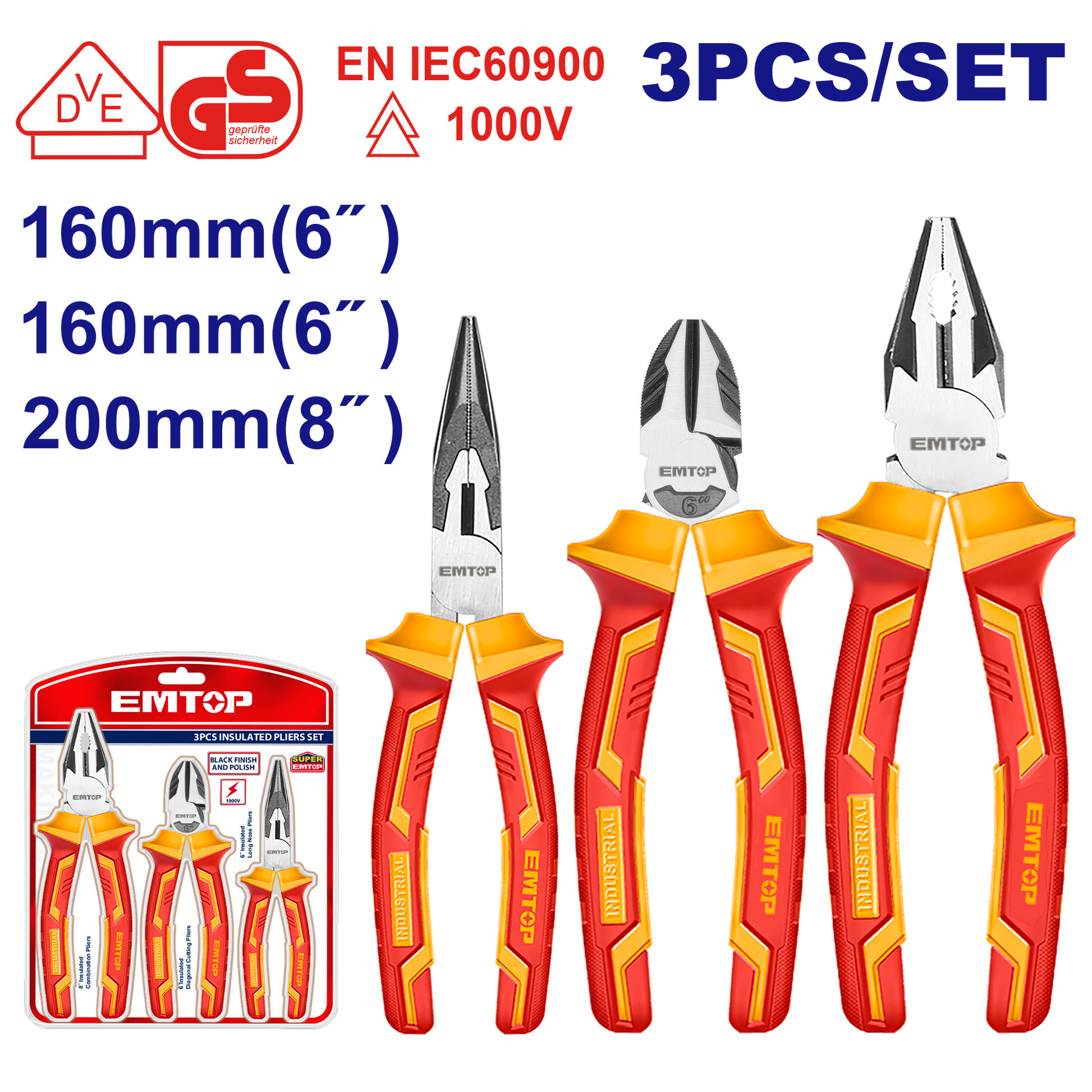 Emtop Ölçü: 8" İzolyasiyalı kombinasiya pleyti 6" İzolyasiyalı uzun burunlu pleyti 6" İzolyasiyalı diaqonal kəsmə pleyti Cr-V, qara örtüklü və cilalanmış İki rəngli tutacaq Yüksək təzyiqə davamlı: 1000V PP askı ilə qablaşdırılıb