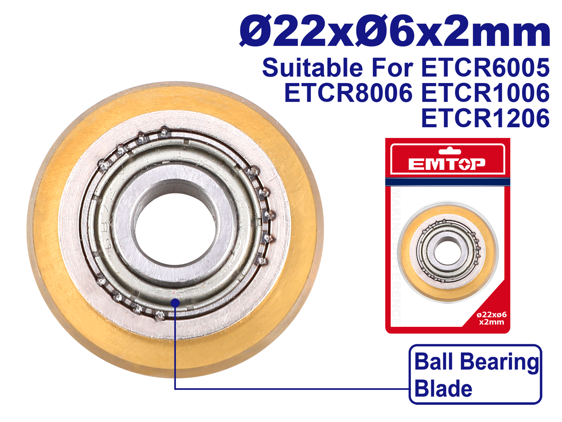 Plitə kəsici bıçaq Topuqlu rulman ilə Material: Volfram karbidi Bıçaq ölçüsü: Ø22 x Ø6 x 2 mm Uyğundur: ETCR6005, ETCR8006, ETCR1006, ETCR1206 modelləri üçün Qablaşdırma: İkiqat blisterlə qablaşdırılmışdır