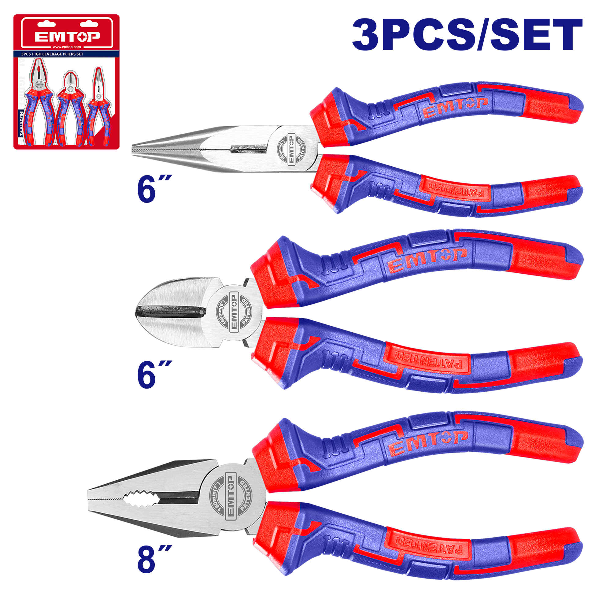 Emtop Ölçü: 8" Kombinasiya pleyti 6" Uzun burunlu pleyti 6" Diaqonal kəsmə pleyti Parlatma və anti-korroziya yağı İki rəngli tutacaq Sürüşən kartla qablaşdırılıb