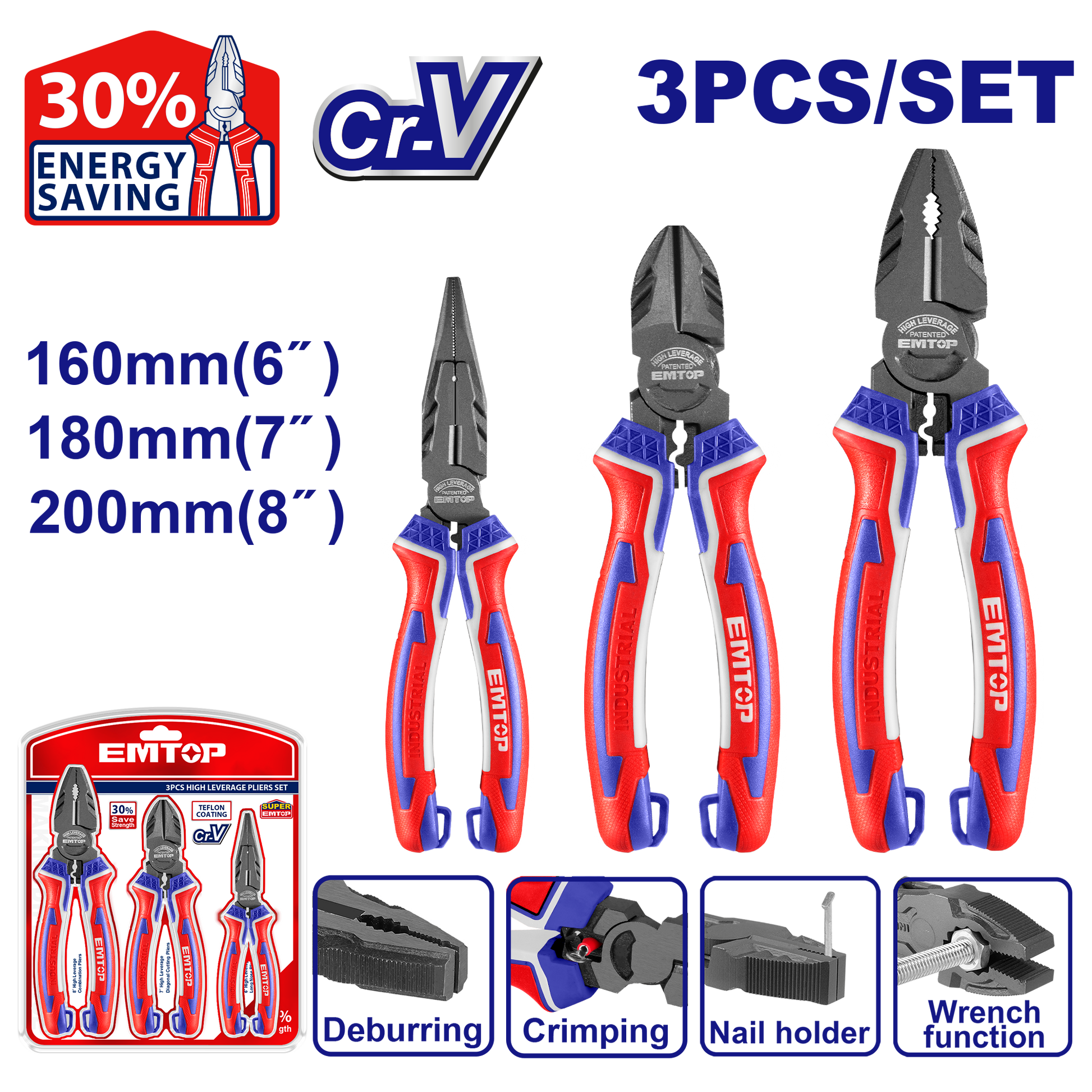 Emtop Ölçü: 8" Yüksək qüvvətli kombinasiya pleyti 7" Yüksək qüvvətli diaqonal kəsmə pleyti 6" Yüksək qüvvətli uzun burunlu pleyti Cr-V, Teflon örtüklü TPR üç rəngli tutacaq Adi pleytlərlə müqayisədə 30% daha az güc sərf edir PP askı ilə qablaşdırılıb