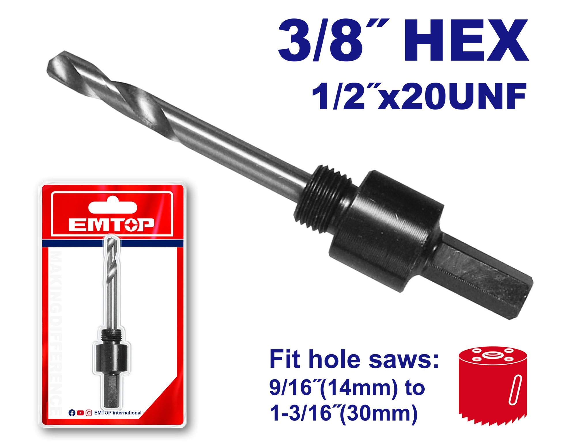 Deşik kəsici üçün arbor3/8" Hex sapDiş ölçüsü: 1/2"*20UNFUyğun deşik kəsicilər: 9/16" (14mm) – 1-3/16" (30mm)Daxildir: 6mm HSS matkapQablaşdırma: ikiqat blisterlə