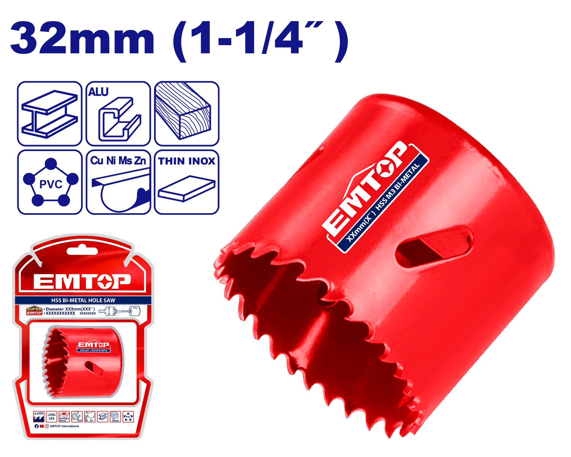 Diametr: 32mm (1-1/4")Kəsmə dərinliyi: 38mm (1-1/2")Material: HSS M3 Bi-metalDiş tipi: dəyişkən 4/6Qablaşdırma: ikiqat blisterlə