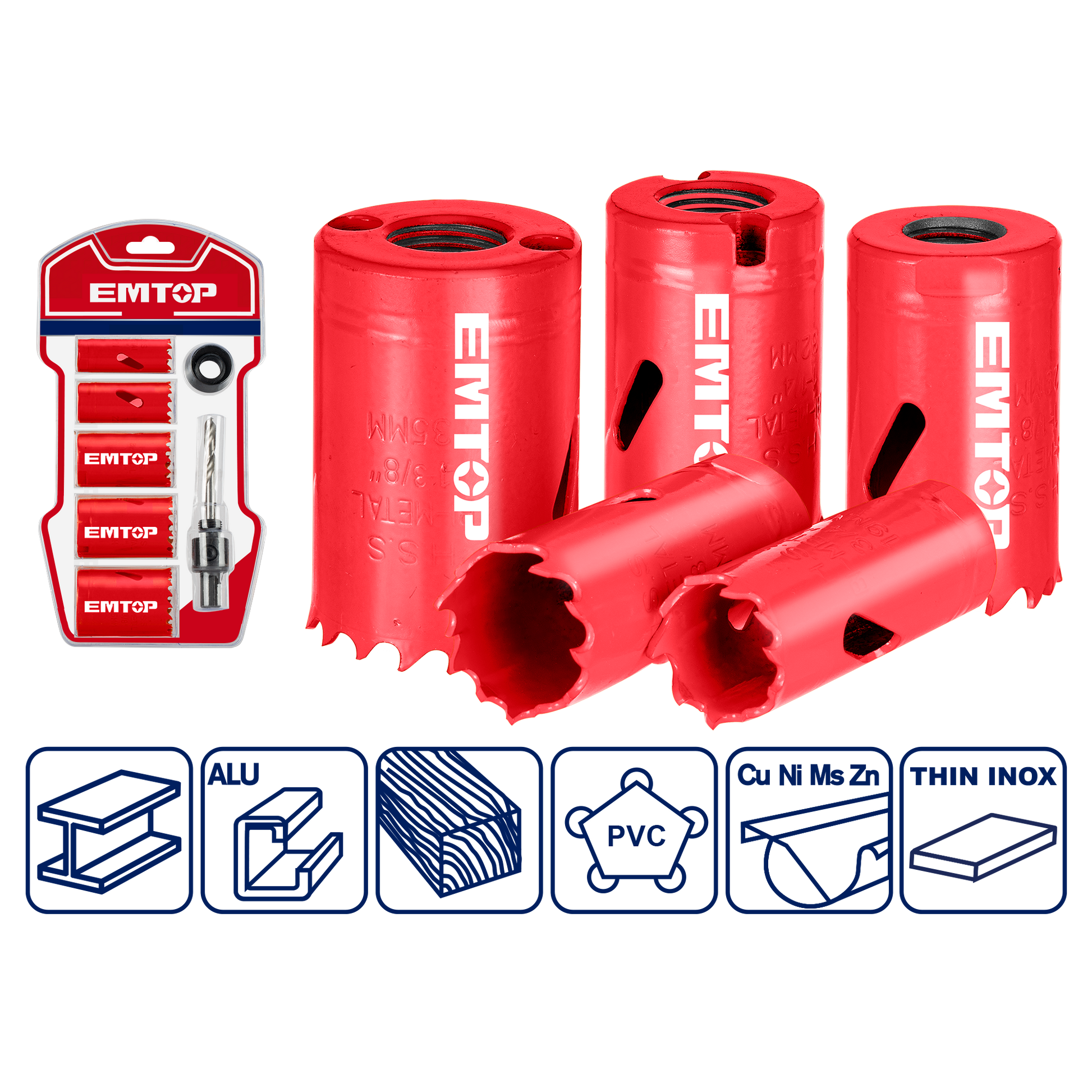 7 ədəd Bi-metal deşik kəsici dəstÖlçülər: 22mm (7/8"), 25mm (1"), 29mm (1-1/8"), 32mm (1-1/4"), 38mm (1-1/2")Daxildir:• 1 ədəd adapter: 1/2"-20 dişli, 5/8"~1/2" dişli deşik kəsicilərə uyğundur• 1 ədəd arbor: 3/8" Hex sap, 9/16"~1-3/16" dişli ölçülərə uyğundurQablaşdırma: ikiqat blisterlə