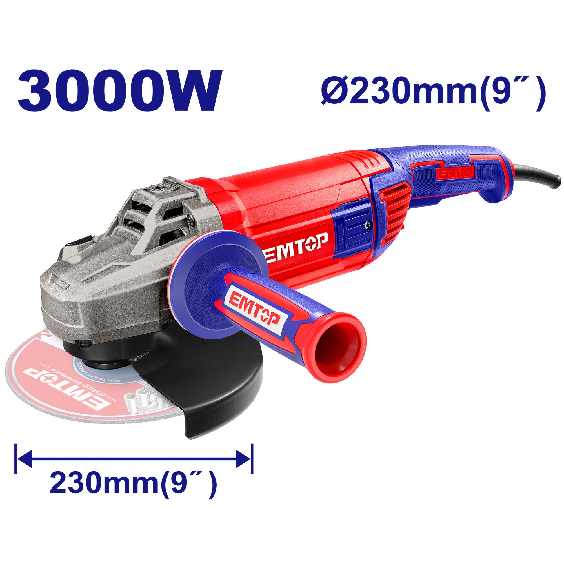 Emtop Gərginlik: 220-240V~50/60HzGiriş gücü: 3000WBoş vəziyyətdə dövriyyə: 6300rpmDisk diametri: 230mmSpindle ipi: M14Daxildir:1 ədəd əlavə tutacaq1 dəst əlavə karbon fırçalarDisk daxil deyilRəngli qutuda qablaşdırılmış