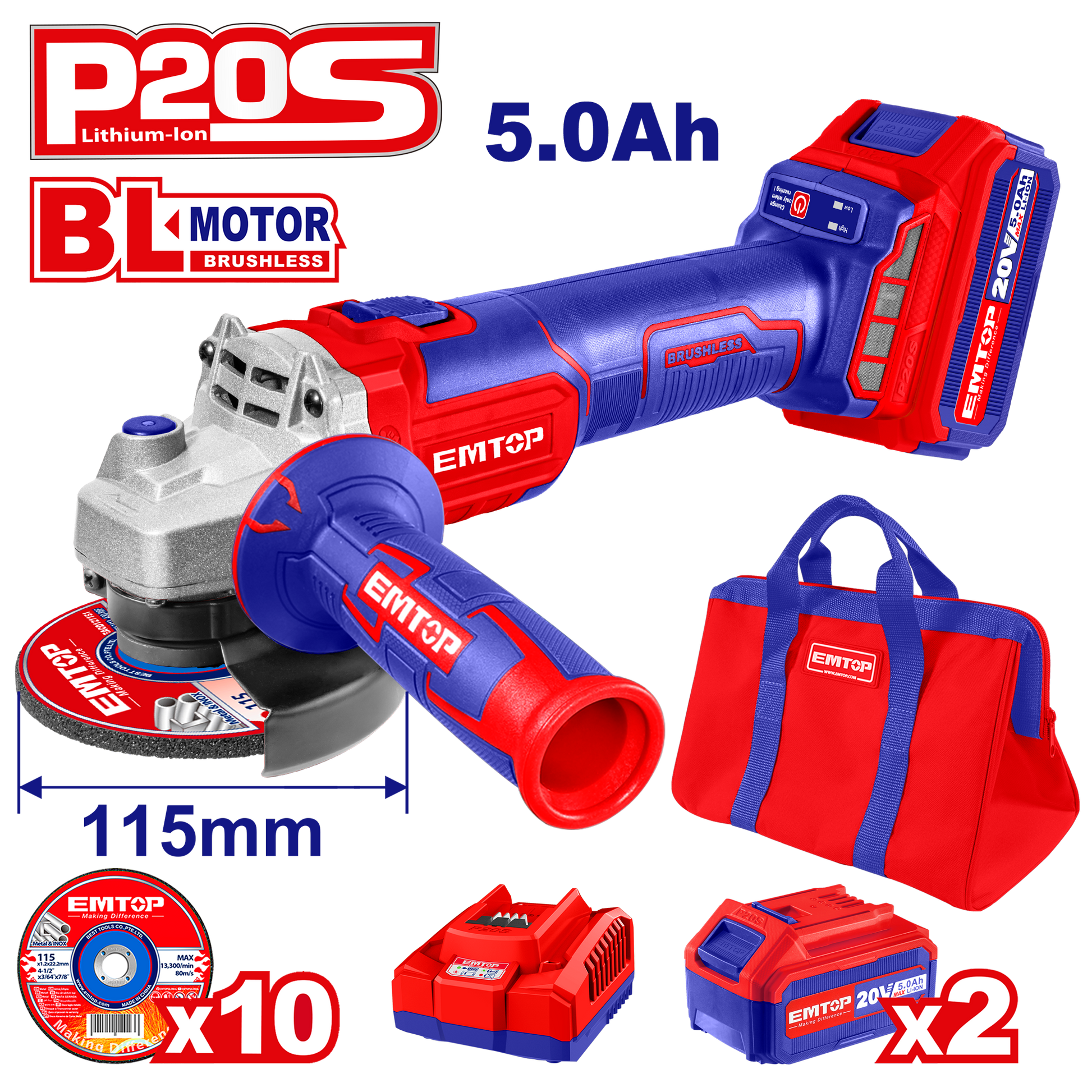 Emtop Fırçasız mühərrik Gərginlik: 20V Yük olmadan sürət: 3000/8500/dəq Diskin diametri: 115mm Şaft ipi: M14 Şarj gərginliyi: 220-240V~50/60Hz 2 ədəd 5.0Ah batareya paketi ilə 1 ədəd 4A şarj cihazı ilə 1 set aşındırıcı metal kəsmə diskləri ilə Kanvas çantada qablaşdırılmış