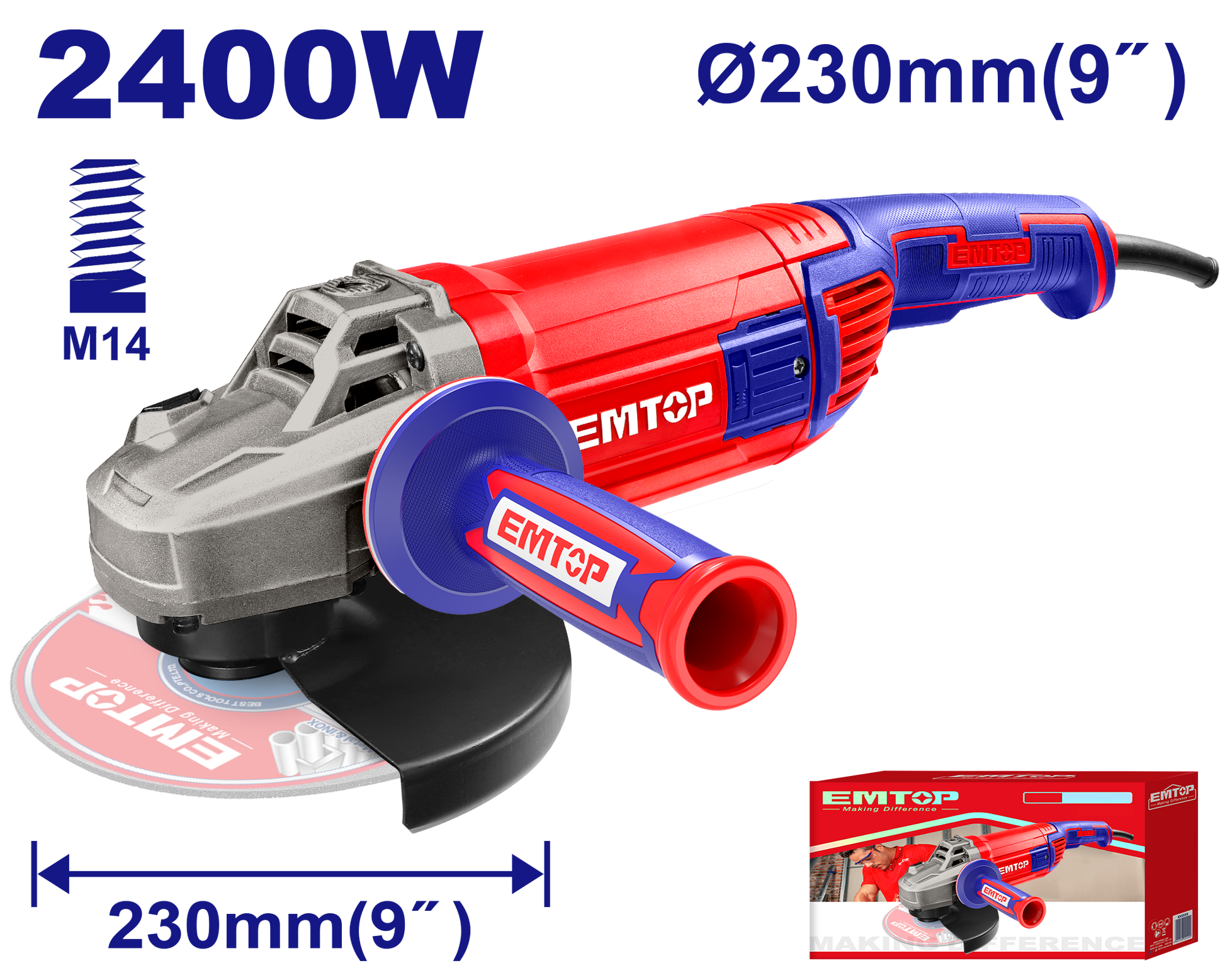 Gərginlik: 220-240V~50/60Hz Giriş gücü: 2400W Boşda fırlanma sürəti: 6400 rpm Disk diametri: 230 mm Mil sapı: M14 Daxildir: 1 ədəd köməkçi tutacaq 1 dəst əlavə kömür fırçaları Disk daxil deyil Qablaşdırma: Rəngli qutu
