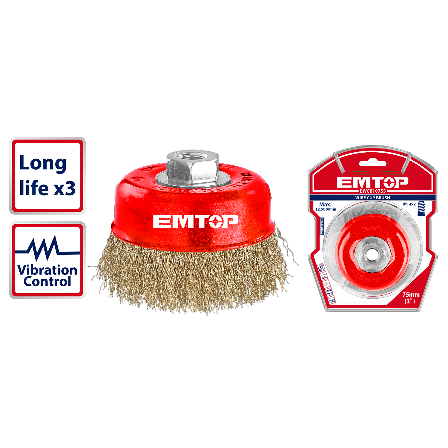 Emtop Diametr: 75mm, 3" Sap: M14x2 Tel diametri: 0.3mm Tel uzunluğu: 23mm Dönmə sürəti: 12500r/dəq Tətbiq olunur: düzəltmə, çapma, kənarların itilənməsi, pasın təmizlənməsi/boyanın çıxarılması, qaynaq yerləri Uyğun materiallar: polad, tökmə polad, yumşaq ağac, bərk ağac İkiqat blister ilə qablaşdırılıb