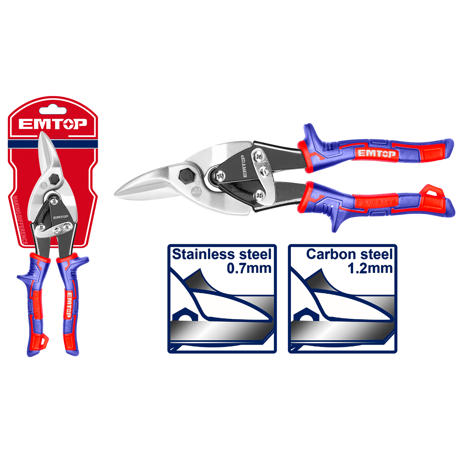 Emtop Bənzərsiz dizaynlı üç tonlu yumşaq tutacaqlı Aviation snip (Sağ) Uzunluq: 250mm (10") Maksimum kəsmə qalınlığı: Karbon polad ≤1.2mm Paslanmaz polad ≤0.7mm Yarım ikili blisterdə qablaşdırılmış