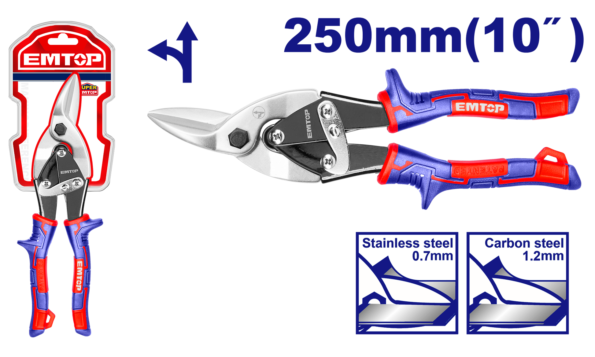Sap: Unikal dizaynlı, üç rəngli yumşaq sapAlət tipi: Aviasiya qayçısı (Sol)Uzunluq: 250mm (10")Maksimum kəsmə qalınlığı:• Karbon polad ≤1.2mm• Paslanmayan polad ≤0.7mmQablaşdırma: Yarım ikiqat blister ilə