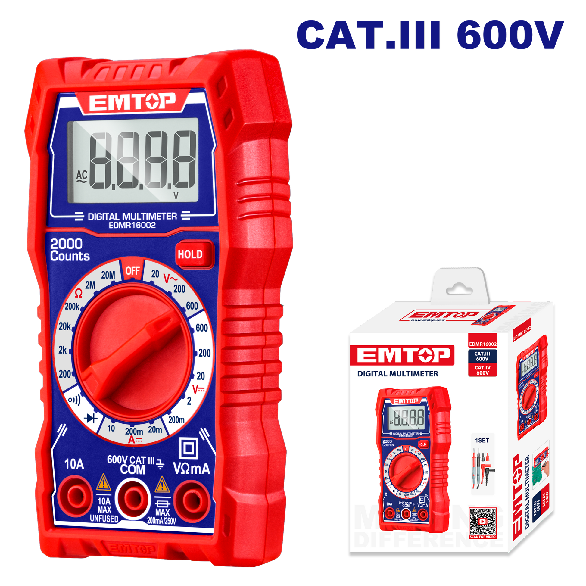 Emtop 2000 sayım LCD ekran DC Gərginlik: 200mV/2V/20V/200V/600V AC Gərginlik: 200V/600V DC Cərəyan: 20mA/200mA/10A Müqavimət: 200Ω/2kΩ/20kΩ/200kΩ/2MΩ/20MΩ Batareya daxildir Rəngli qutuda paketlənmişdir