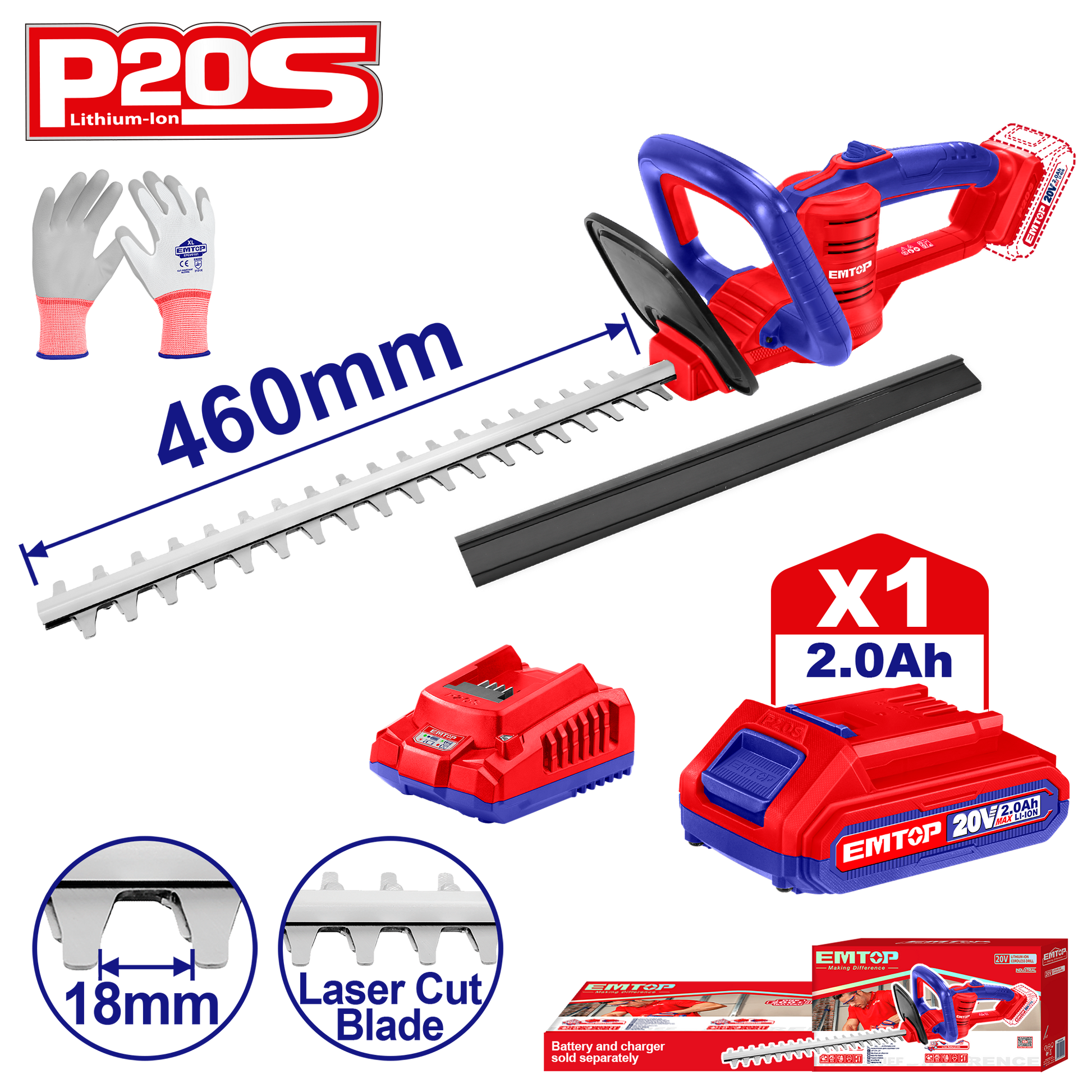 Emtop Gərginlik: 20V Maksimum sürət: 2800 spm Bıçaq uzunluğu: 460mm Maksimum kəsmə diametri: 18mm Lazer kəsimli bıçaq Şarj gərginliyi: 220-240V~50/60Hz 1 ədəd 2.0Ah batareya paketi ilə 1 ədəd şarj cihazı ilə 1 ədəd toxunmuş və PVC nöqtəli əlcək ilə Rəngli qutuda qablaşdırılmış