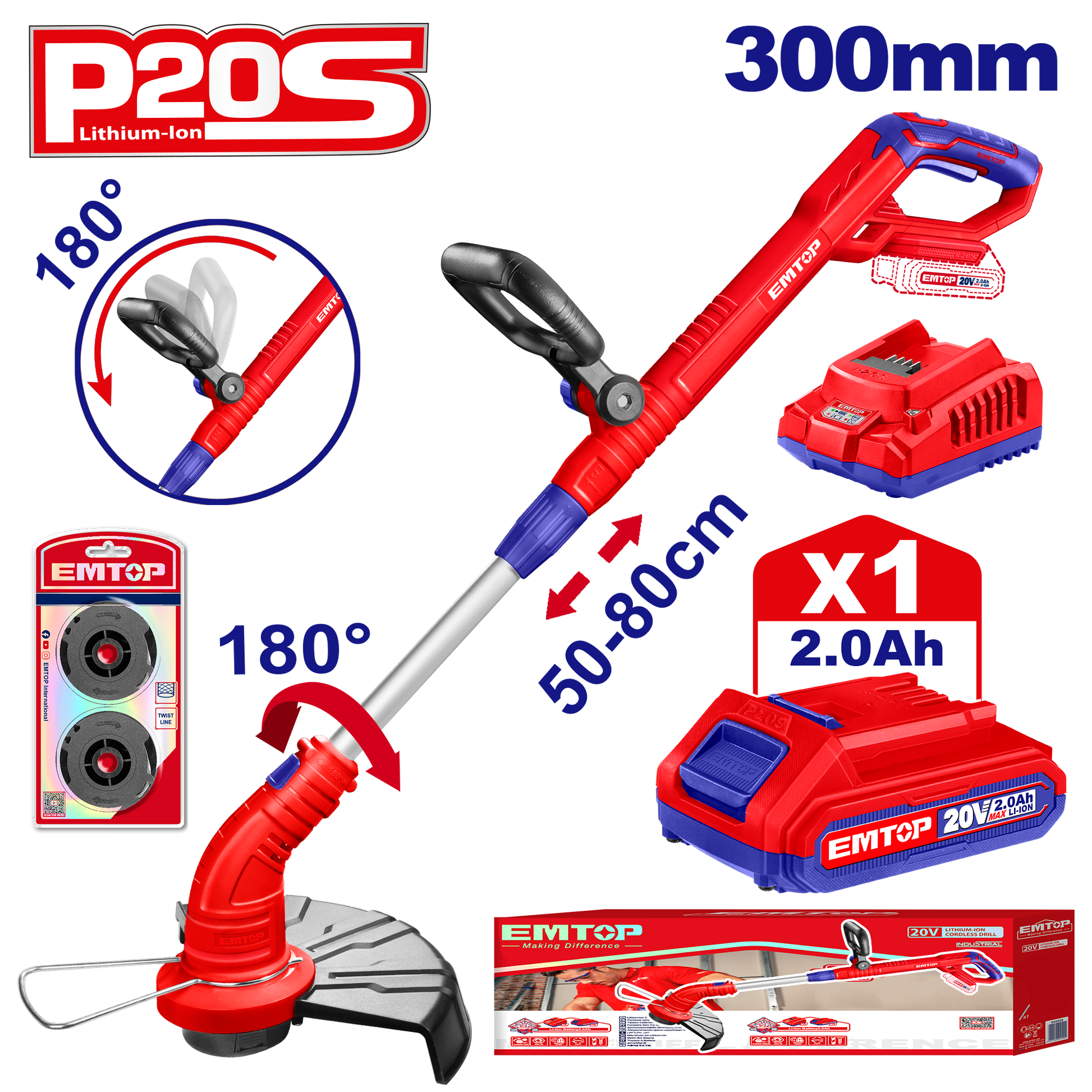 Emtop Gərginlik: 20VBoş dönmə sürəti: 8200rpmKəsmə diametri: 300mmTel diametri: 1.6mm ipliTel uzunluğu: 5mKənarları düzəltmə funksiyasıŞarj gərginliyi: 220-240V~50/60Hz1 ədəd 2.0Ah batareya dəsti (EBPK20011)1 ədəd şarj cihazı (EFCR20200)2 ədəd tel rulonuRəngli qutuda qablaşdırılıb