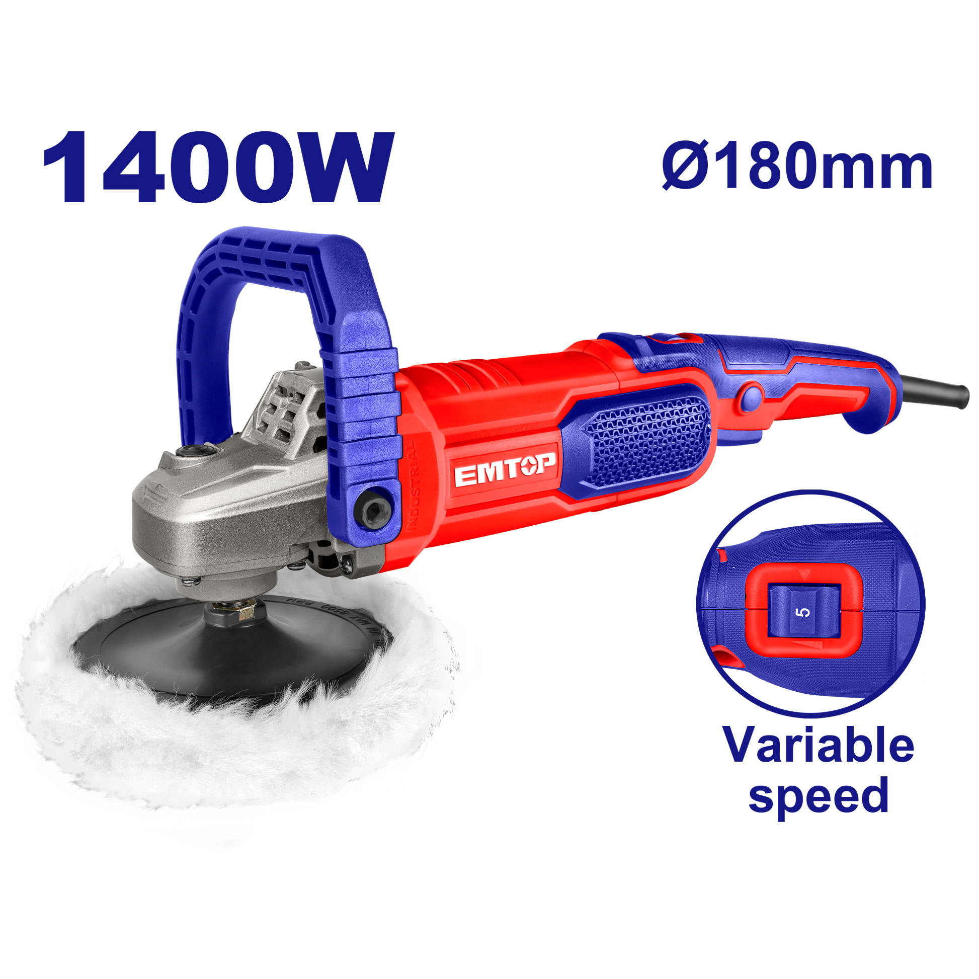 Emtop Gərginlik: 220-240V~50/60Hz Giriş gücü: 1400W Yük-süz sürət: 1500-3600rpm Cilalama yastığının diametri: 180mm Dəyişən sürət nəzarəti Bloklama düyməsi Alüminium dişli qutusu Daxildir: 1 ədəd D-qolu 1 ədəd yapışqan cilalama yastığı 1 ədəd cilalama başlığı 1 dəst əlavə karbon fırçalar Rəngli qutuda paketlənmişdir