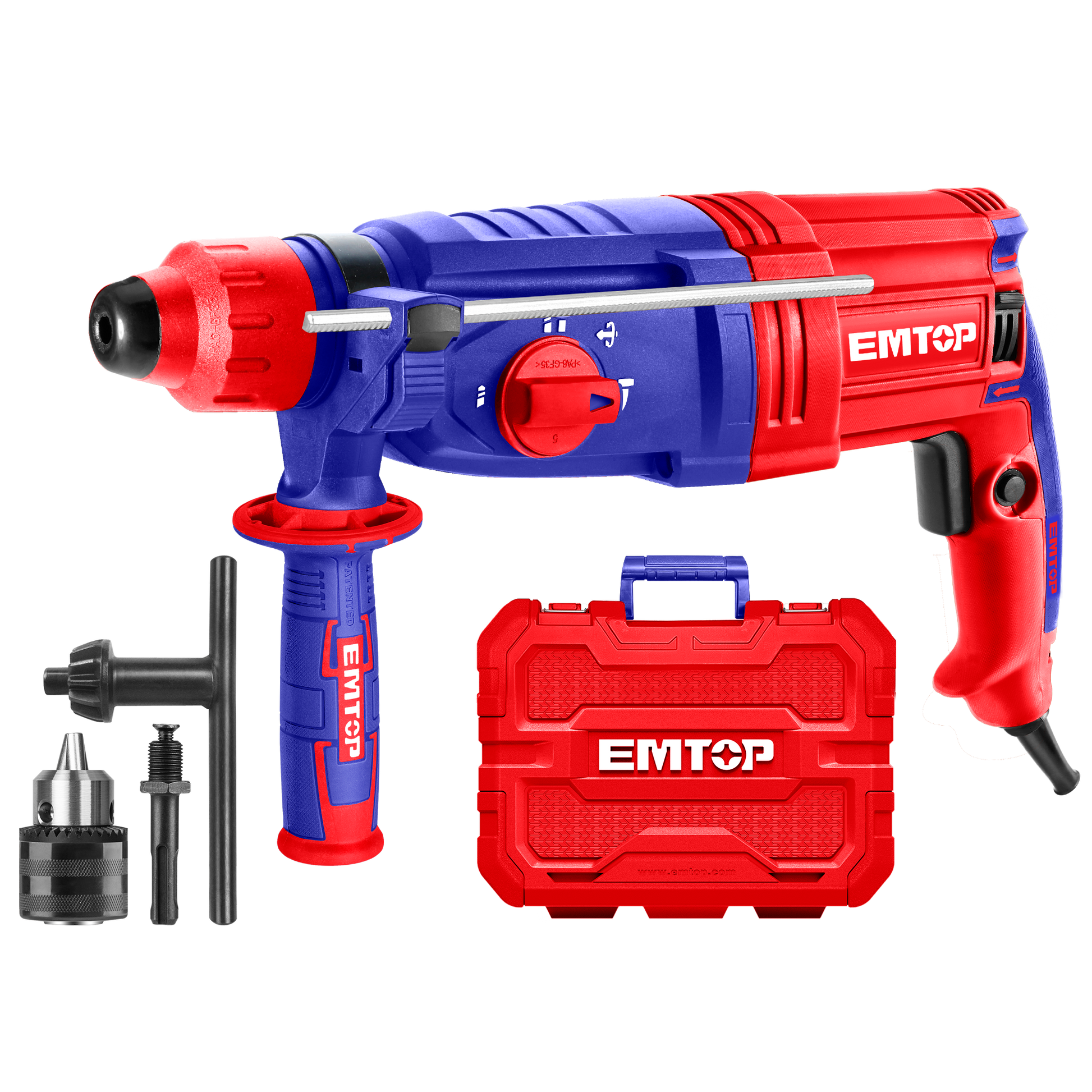 Emtop Gərginlik: 220-240V~50/60HzGiriş gücü: 950WBoş yerdə sürət: 0-1050 rpmZərbə sürəti: 0-4670 bpmZərbə enerjisi: 2.5JMaksimum qazma qabiliyyəti:Beton: 28mmPolad: 13mmTaxta: 30mmSDS plus patron sistemiDaxildir:1 ədəd 13mm açarlı patron3 ədəd qazma ucu və 2 ədəd dəlmə iskənəsi1 dəst əlavə kömür fırçalarıBMC ilə qablaşdırılıb
