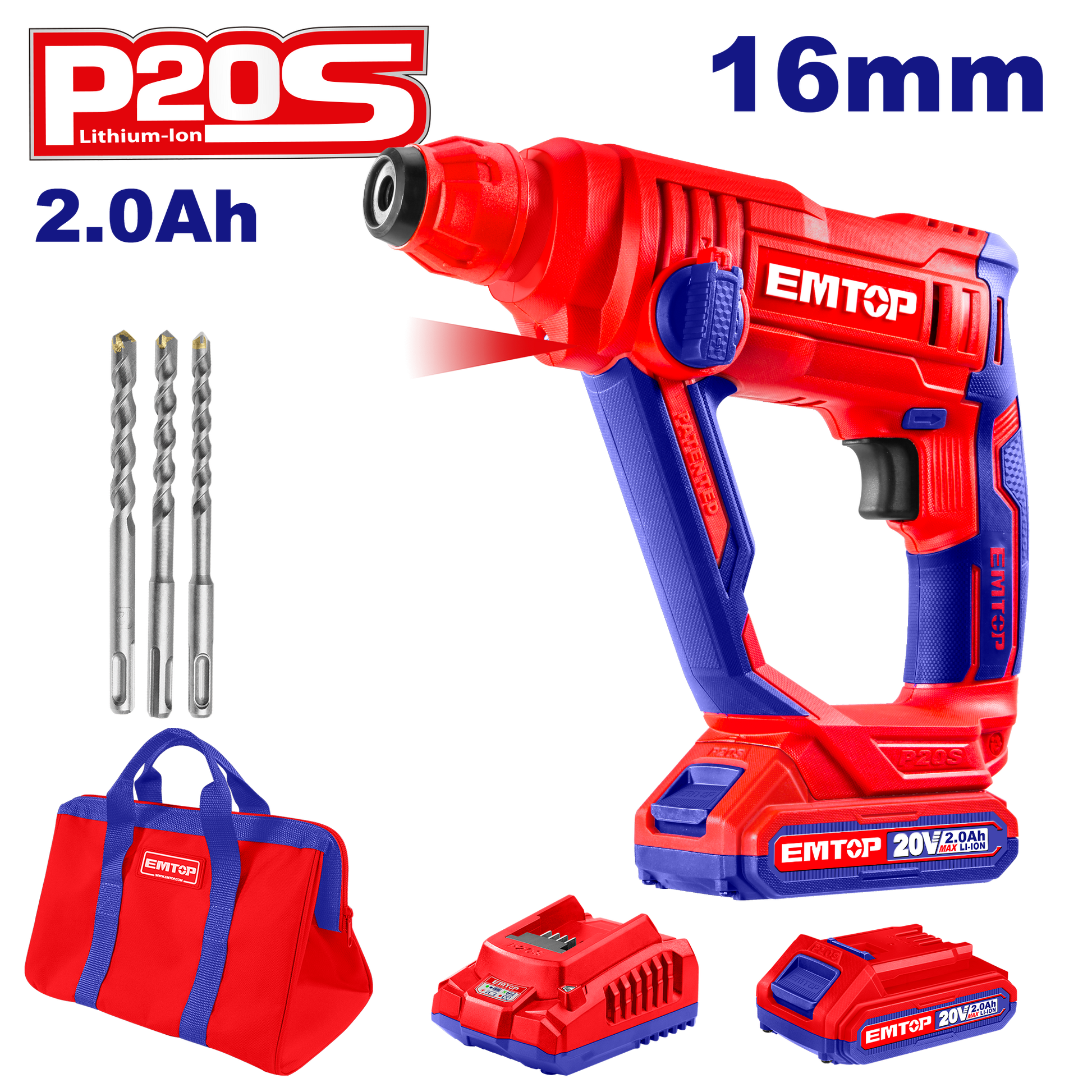 Emtop Gərginlik: 20V Yük olmadan sürət: 0-900 dövr/dəq Zərbə sürəti: 0-5100 bpm Zərbə gücü: 1.5J Betonda maksimum qazma qabiliyyəti: Φ13mm 1 ədəd 2.0Ah batareya paketi ilə 1 ədəd şarj cihazı ilə SDS plus patron sistemi 3 ədəd qazma ucu ilə İnteqrasiya olunmuş işıq Şarj gərginliyi: 220-240V~50/60Hz Kanvas çantada qablaşdırılmış