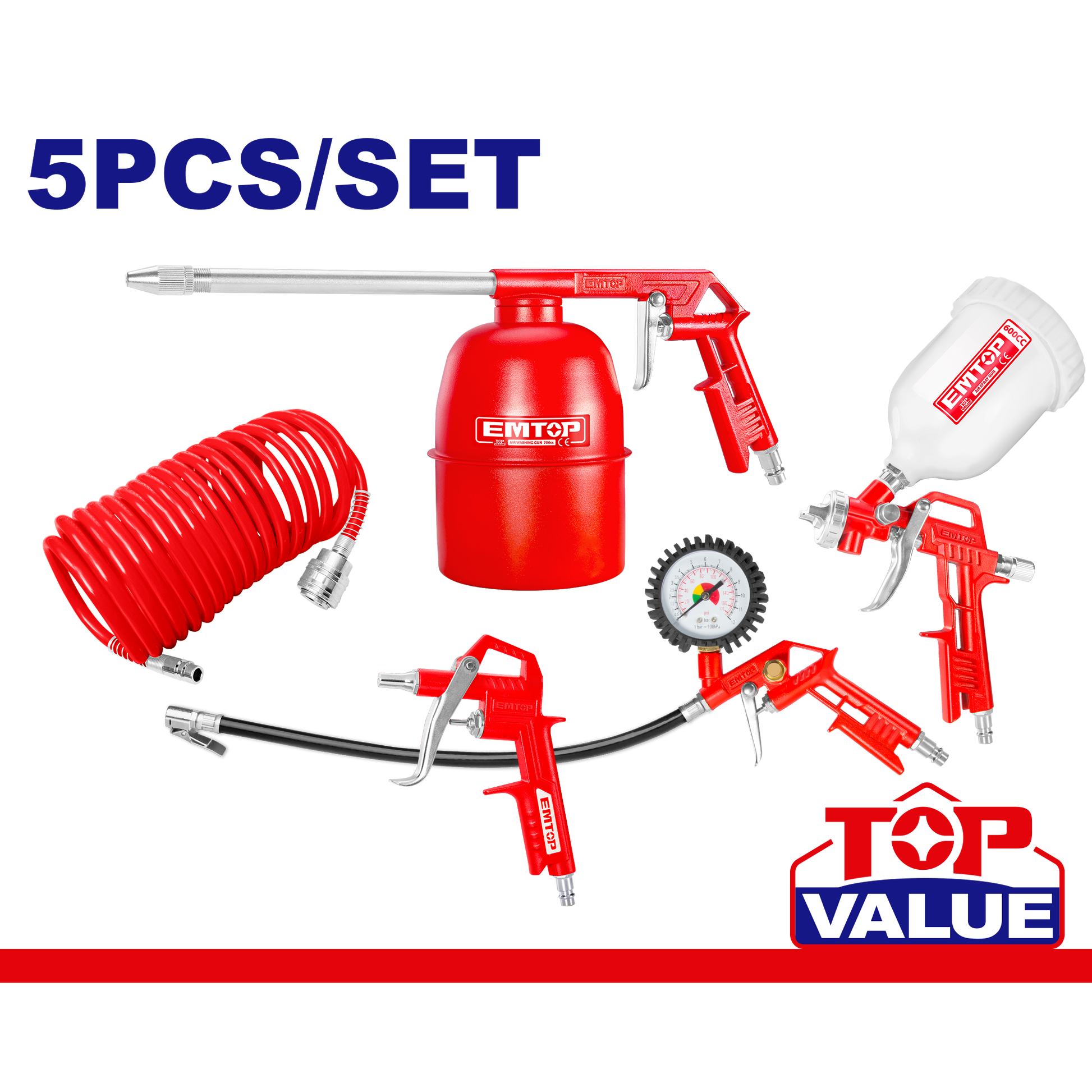 Emtop Hava alətləri 5 ədəd dəst Yalnız Avropa tipli bağlantı ilə Recoil hose Uzunluq: 4m, Diametr: 8mm Hava püskürtücü Dəlmə uzunluğu: 16mm Hava sprey silahı İşləmə təzyiqi: 3-4bar Rəng tutumu: 600cc Nümunə eni: 180-250mm Hava yuyucu silah İşləmə təzyiqi: 4bar Yuma tutumu: 750cc Hava təkər şişirmə silahı Maksimum təzyiq: 12Bar Rəngli qutuda qablaşdırılmış