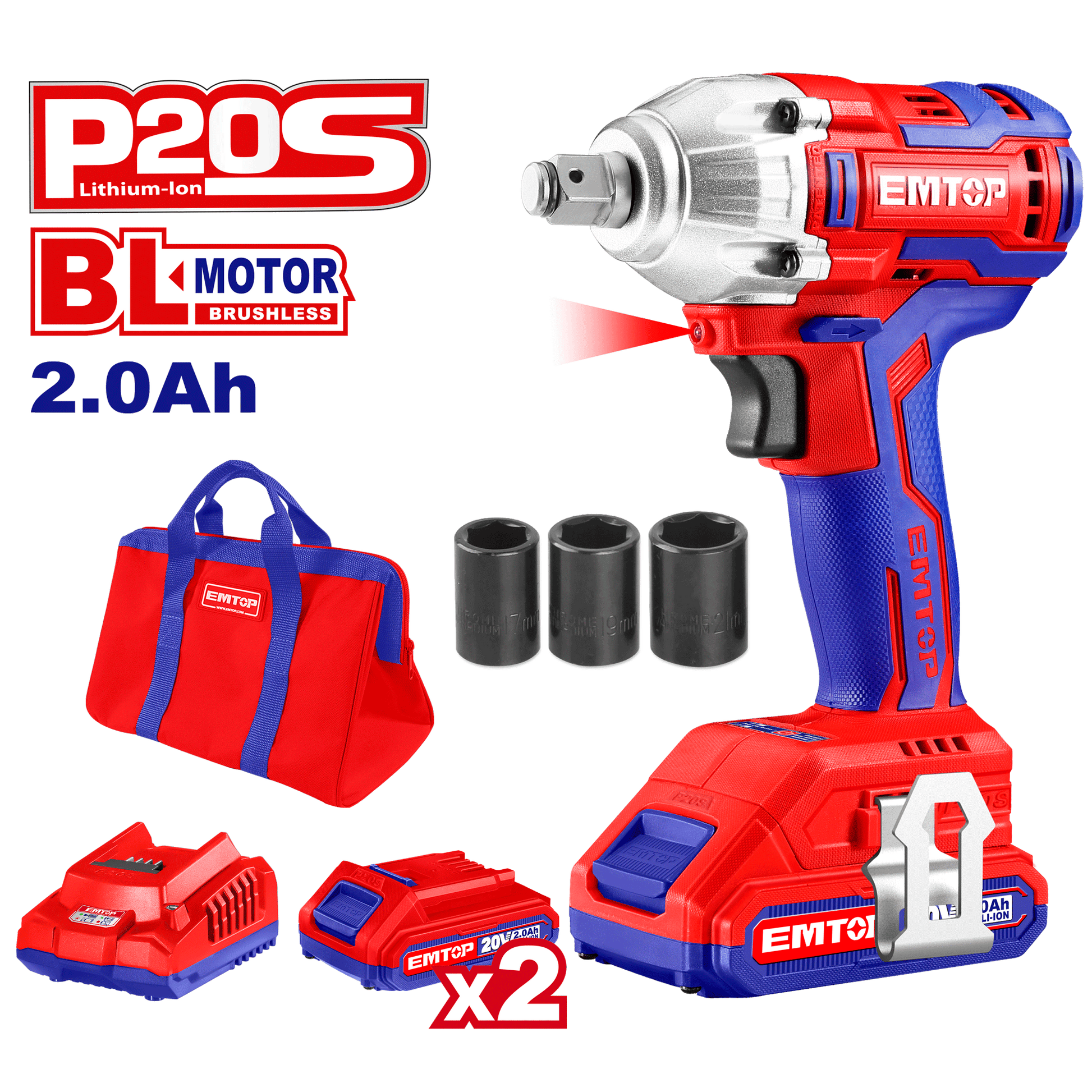 Emtop Fırçasız mühərrik Gərginlik: 20V Kvadrat sürücü: 1/2" Yük olmadan sürət: 0-1300/0-2100rpm Zərbə sürəti: 0-2000/0-3300bpm Maksimum fırlanma: 300NM 2 ədəd 2.0Ah batareya paketi ilə 1 ədəd şarj cihazı ilə Şarj gərginliyi: 220-240V~50/60Hz İnteqrasiya olunmuş işıq LED batareya güc göstəricisi 3 ədəd dişli (17 19 21mm) ilə Kanvas çantada qablaşdırılmış
