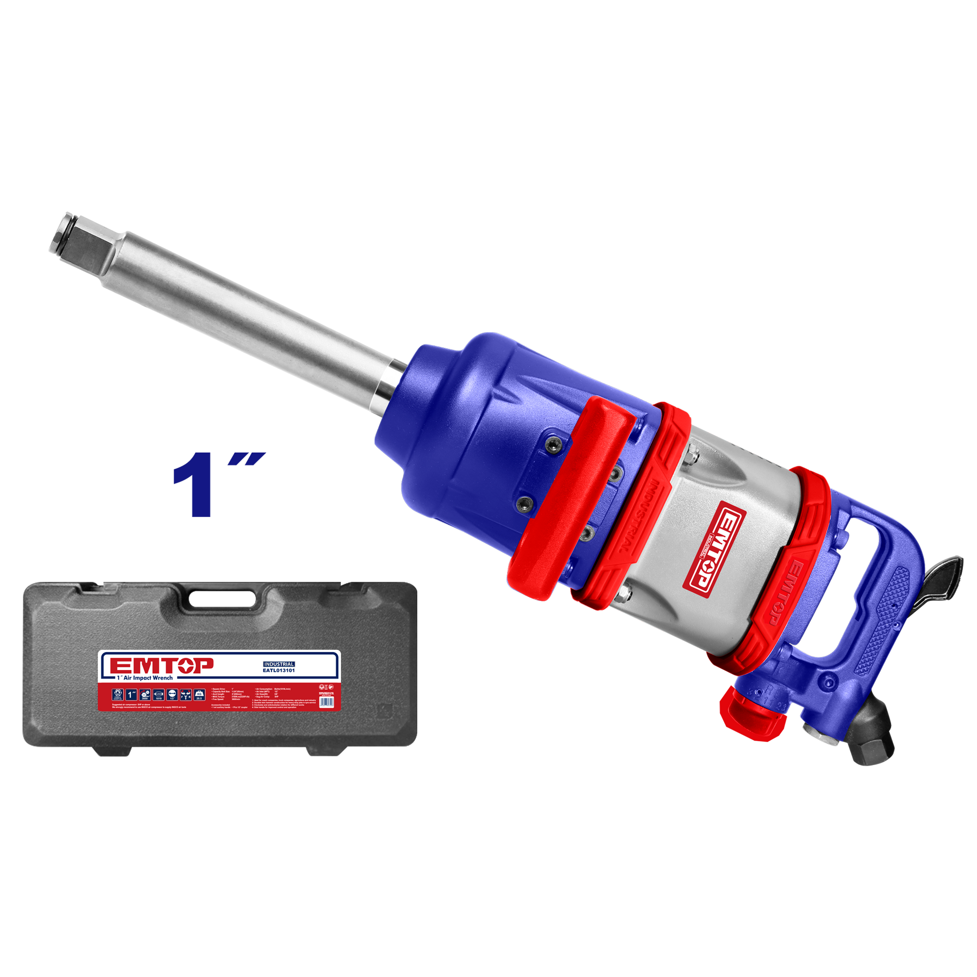 Emtop Kvadrat drive: 25.4mm (1") Boşda sürət: 3600/dəq Maksimum tork: 3100Nm (2220Ft-lb) Çəki: 18.5KG Ümumi konnektor ilə. Hava istehlakı: 36Cfm (1019l/min) Anvil: 200mm (8") Bolt ölçüsü: 45mm (1-3/4") Hava girişi: 1/2" Hava hortumu: 5/8" BMC ilə paketlənmişdir.