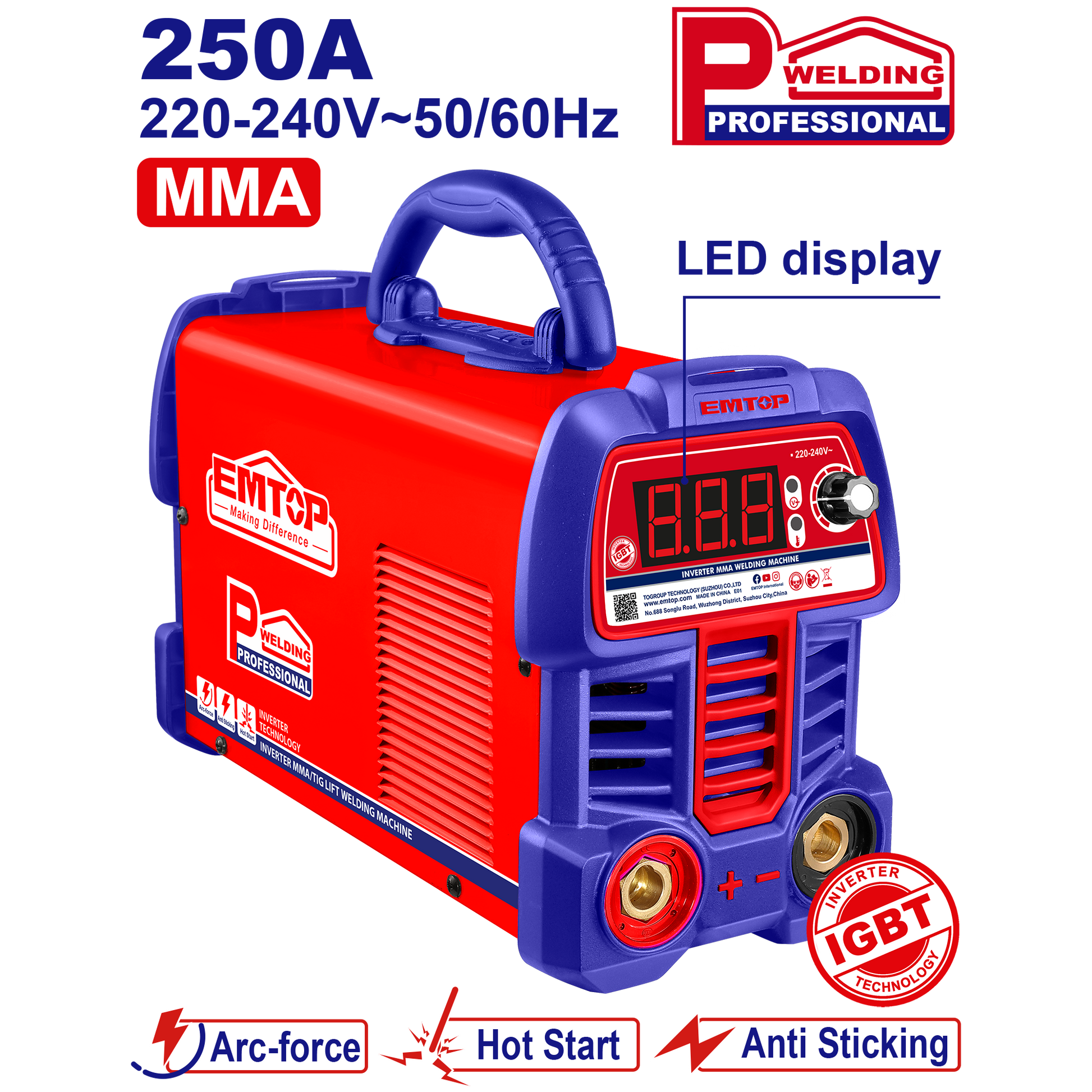 Emtop IGBT inverter texnologiyasıGiriş gərginliyi: 1~220-240VTezlik: 50/60HzÇıxış cərəyanı: 15-250Aİş dövrü: 250A@60%LED göstəriciYük olmayan gərginlik: 80VMaksimum çıxış cərəyanı: 250AElektrodun diametri: 1.6-5.0mmAnti-stick / İsti başlanğıc / Arc-force1 ədəd elektrod tutucu kabel ilə1 ədəd yer klipi kabel ilə1 ədəd tel fırçası1 ədəd qapaqRəngli qutuda qablaşdırılmış