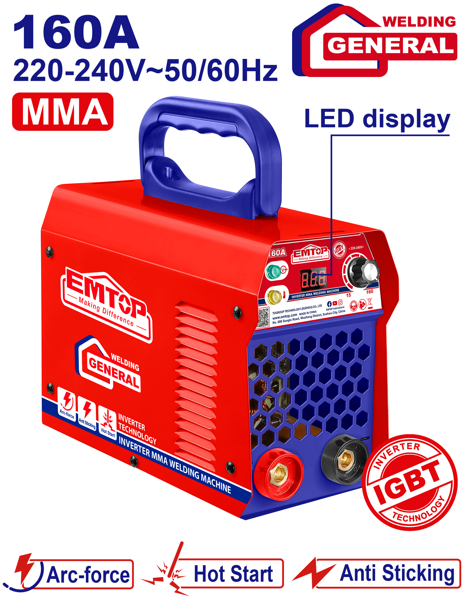 Emtop IGBT inverter texnologiyası Giriş gərginliyi (V): 1~220-240 Tezlik (Hz): 50/60 Çıxış cərəyanı (A): 15-160 İş dövrü (%): 160A@40% LED ekran Boşda gərginlik (V): 74 Maksimal çıxış cərəyanı (A): 160 Elektrodun diametri (mm): 1.6-4.0 Anti-stick/İsti başlama/Arch-forc 1 ədəd elektrod tutucusu ilə kabel 1 ədəd yer klipi ilə kabel 1 ədəd tel fırçası 1 ədəd başlıq 1 ədəd daşınan kəmər Rəngli qutuda paketlənmişdir