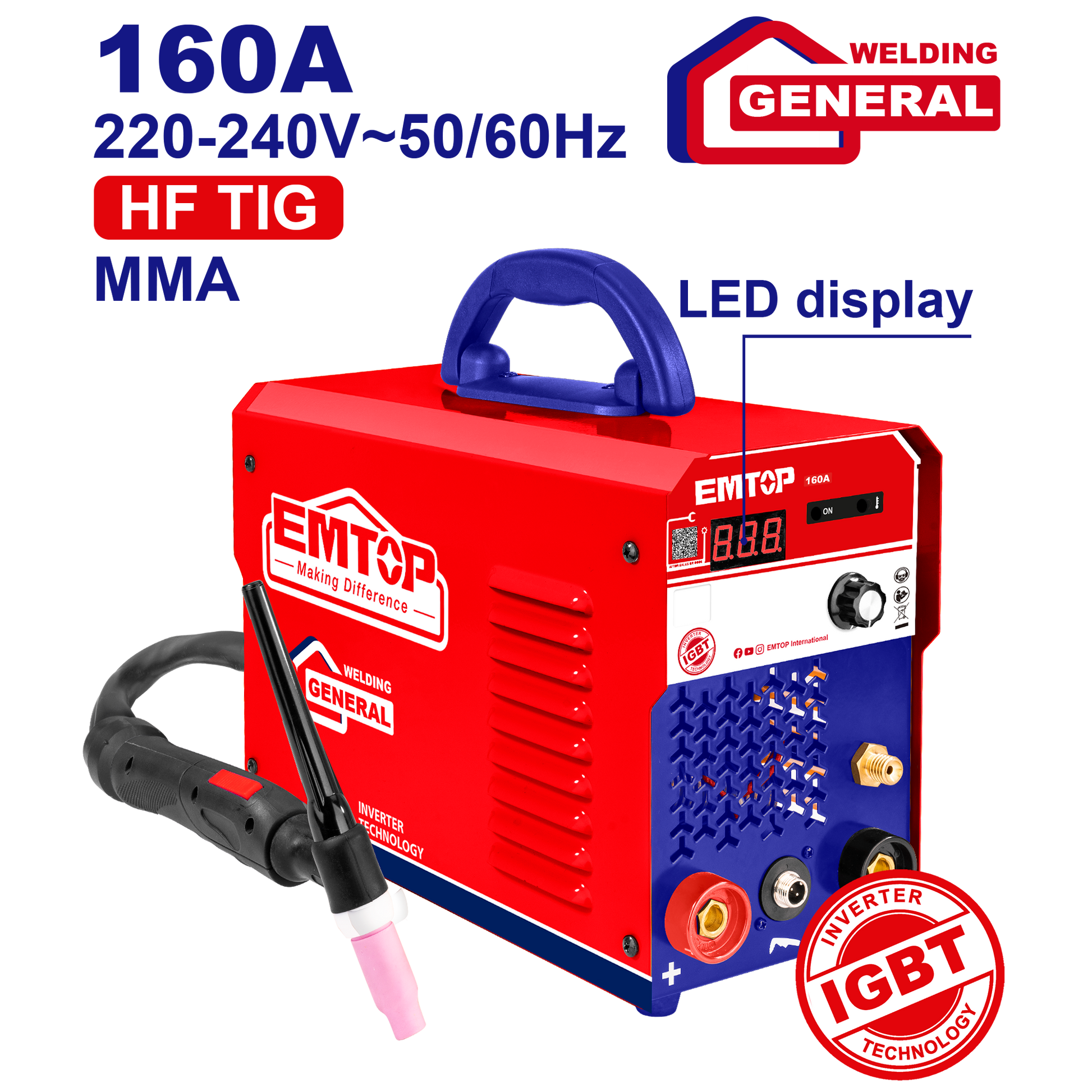 Emtop İnverter TIG/MMA qaynaq maşını Giriş gərginliyi (V): 1~220-240 Tezlik (Hz): 50/60 TIG çıxış cərəyanı (A): 15-160 MMA çıxış cərəyanı (A): 15-160 İş dövrü (%): 40% LCD göstərici Puls və nöqtə funksiyası ilə TIG yük olmayan gərginlik (V): 85 MMA yük olmayan gərginlik (V): 85 MMA elektrodun diametri (mm): 1.6-4.0 1 ədəd elektrod tutucu kabel ilə 1 ədəd yer klipi kabel ilə 1 ədəd tel fırçası və 1 ədəd qapaq 1 ədəd TIG fənəri Rəngli qutuda qablaşdırılmış