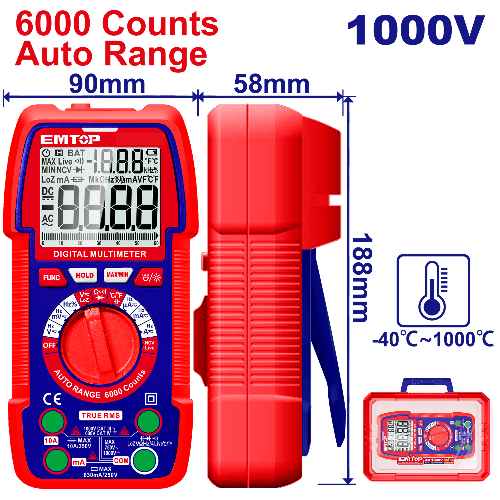 Göstərmə: TRUR RMS 6000 sayımAvtomatik aralıq seçimiDC/AC Cari: 6000uA/60mA/600mA/10ADC Gərginliyi: 600mV/6V/60V/600V/1000VAC Gərginliyi: 600mV/6V/60V/600V/750VƏlavə müqavimət: 600Ω/6kΩ/60kΩ/600kΩ/6MΩ/60MΩKapasitansiya: 10nF/100nF/1000nF/10uF/1000uF/10mF/100mFFrekans: 10Hz/100Hz/1000Hz/10kHz/100kHz/1000kHz/10MHzDuty cycle: 1%~95% ±(3.0% +3)Temperatur: -40.0℃~1000.0℃ (-40.0℉~1832.0℉)Təmassız gərginlik aşkarlamaCanlı xətt və neytral xətt fərqləndirməData saxlanılmasıLowzFaza funksiyasıDiod testiDavamlılıq testiGeribildirim funksiyasıFlaş işıq funksiyasıAşağı batareya göstəricisi funksiyasıGiriş LED göstəricisi funksiyasıYüksək gərginlik xəbərdarlığı funksiyası3 ədəd LR03 AAA batareya iləQablaşdırma: Plastik qutu
