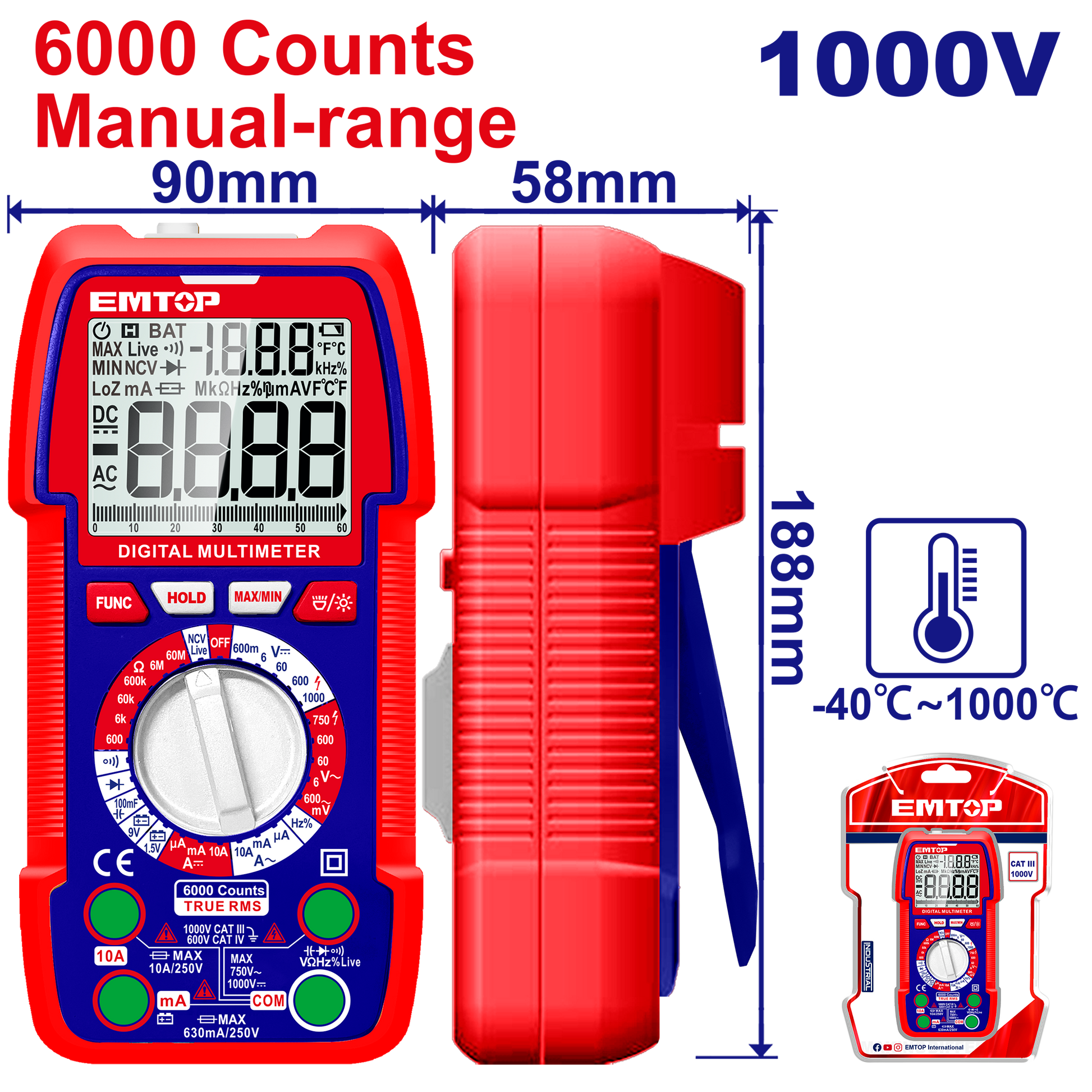 Göstərmə: TRUR RMS 6000 sayımDC/AC Cari: 6000uA/60mA/600mA/10ADC Gərginliyi: 600mV/6V/60V/600V/1000VAC Gərginliyi: 600mV/6V/60V/600V/750VƏlavə müqavimət: 600Ω/6kΩ/60kΩ/600kΩ/6MΩ/60MΩKapasitansiya: 10nF/100nF/1000nF/10uF/1000uF/10mF/100mFFrekans: 10Hz/100Hz/1000Hz/10kHz/100kHz/1000kHz/10MHzDuty cycle: 1%~95% ±(2.0% +3)Təmassız gərginlik aşkarlamaCanlı xətt və neytral xətt fərqləndirməDiod testiMax/Min və Data saxlanılması, geribildirim funksiyasıFlaş işıq funksiyasıAşağı batareya göstəricisi funksiyasıGiriş jak LED göstəricisi ilə3 ədəd LR03 AAA batareyası iləQablaşdırma: İkiqat blister
